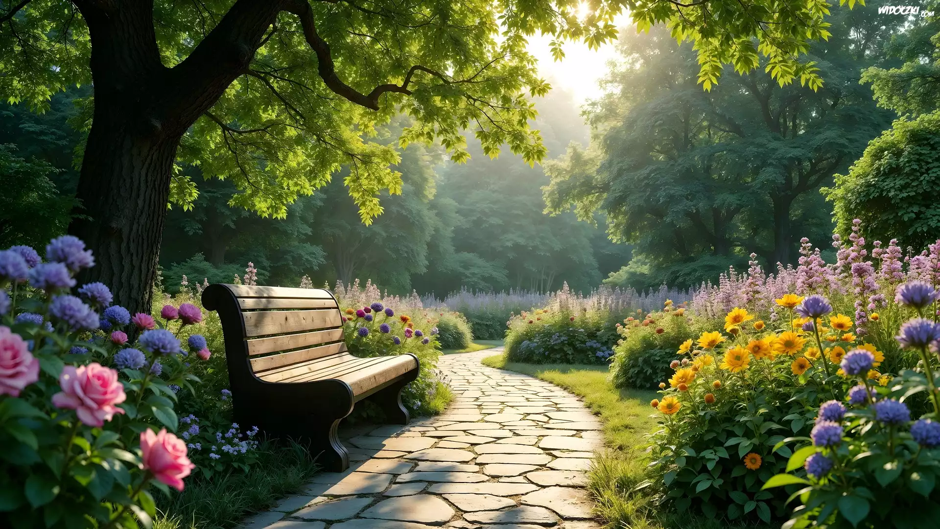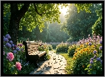 Park, Drzewa, Kwiaty, Ławka, Ścieżka, Kamienista