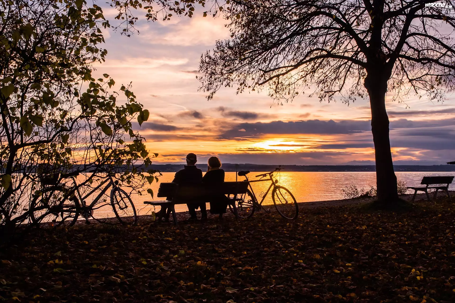 Zachód słońca, Jezioro, Ławka, Drzewa, Ludzie