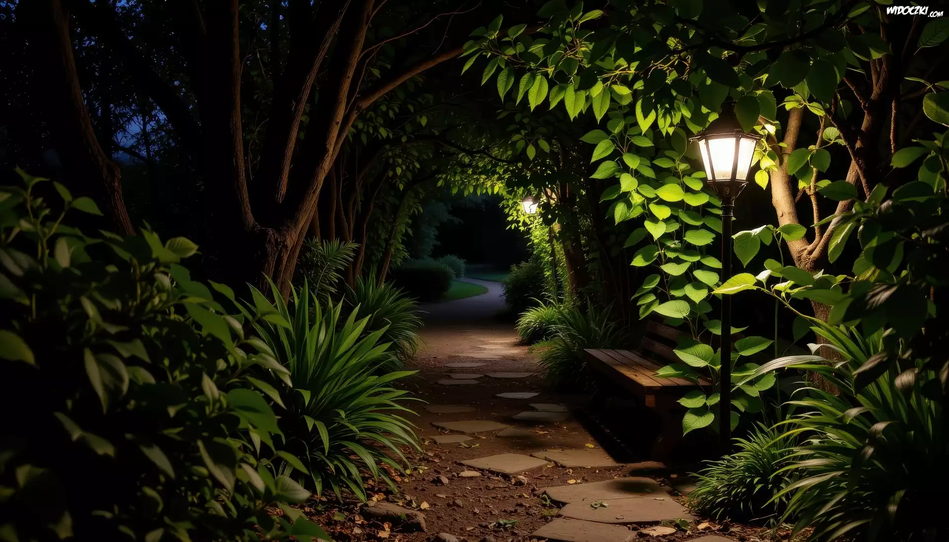 Noc, Park, Drzewa, Ławka, Latarnie, Ścieżka