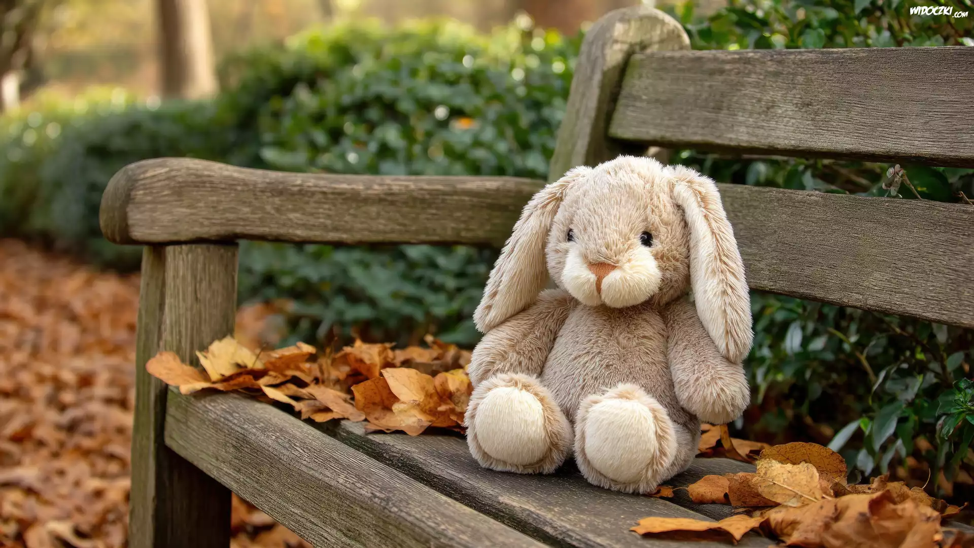 Zdjęcia, Zabawka, Królik, Liście, Ławka