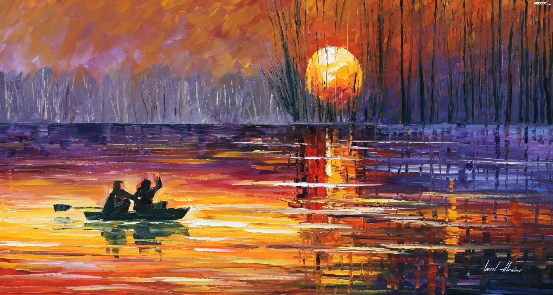 Zdjęcia, Malarstwo, Leonid Afremov, Jezioro, Łódka, Drzewa, Wschód słońca