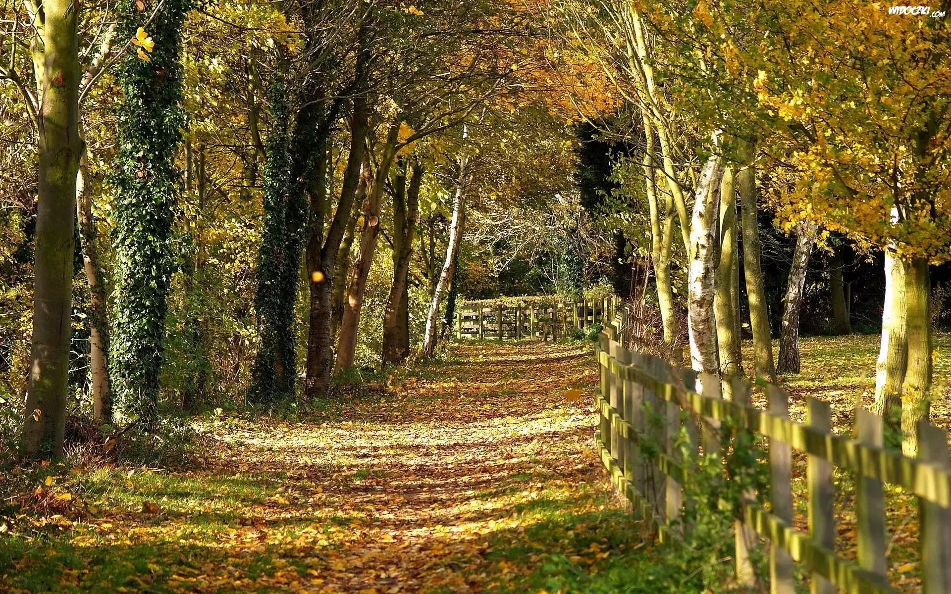Zdjęcia, Leśna, Dróżka, Ogrodzenie, Jesień