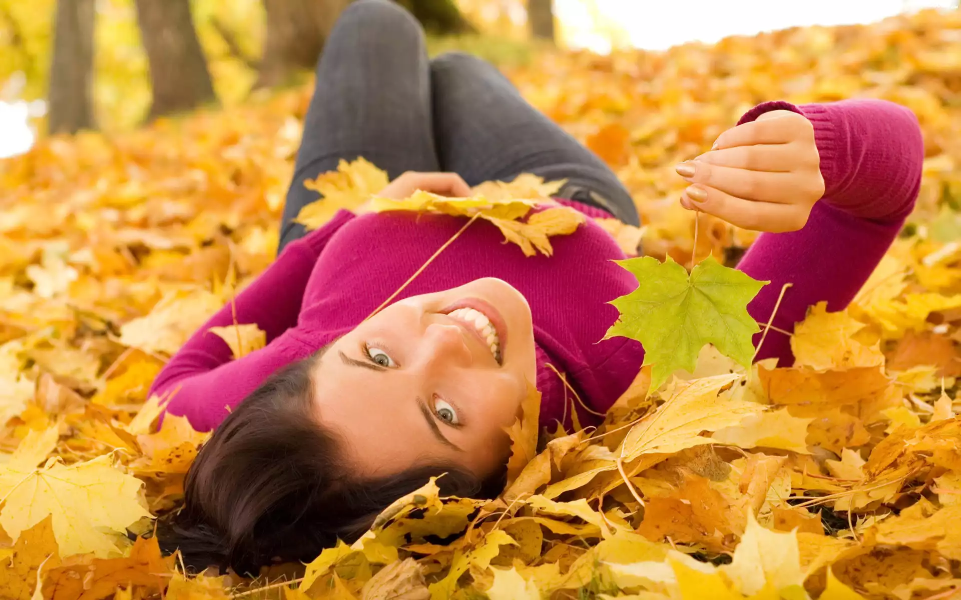 Kobieta, Leżąca, Jesień, Liście, Uśmiech, Oczy, Zęby
