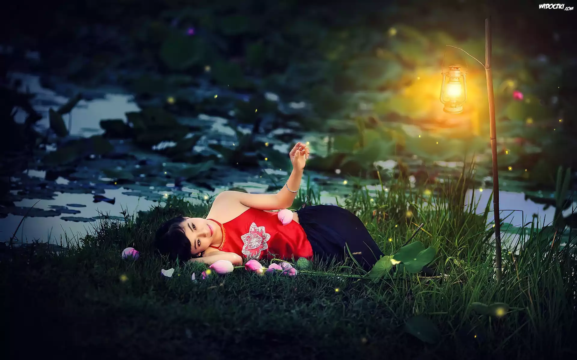 Leżąca, Brunetka, Łąka, Kwiaty, Latarenka, Lampion