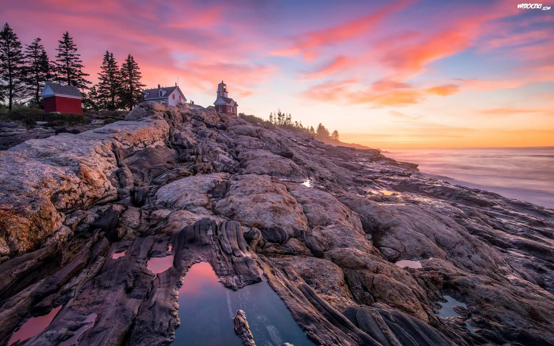 Morze, Skały, Latarnia morska, Pemaquid Point Lighthouse, Wieczór, Domy, Drzewa, Zachód słońca, Stan Maine, Stany Zjednoczone |