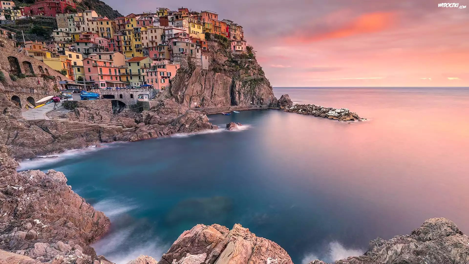 Włochy, Gmina Riomaggiore, Manarola, Morze Liguryjskie, Cinque Terre, Kolorowe, Domy, Skały, Zatoka |