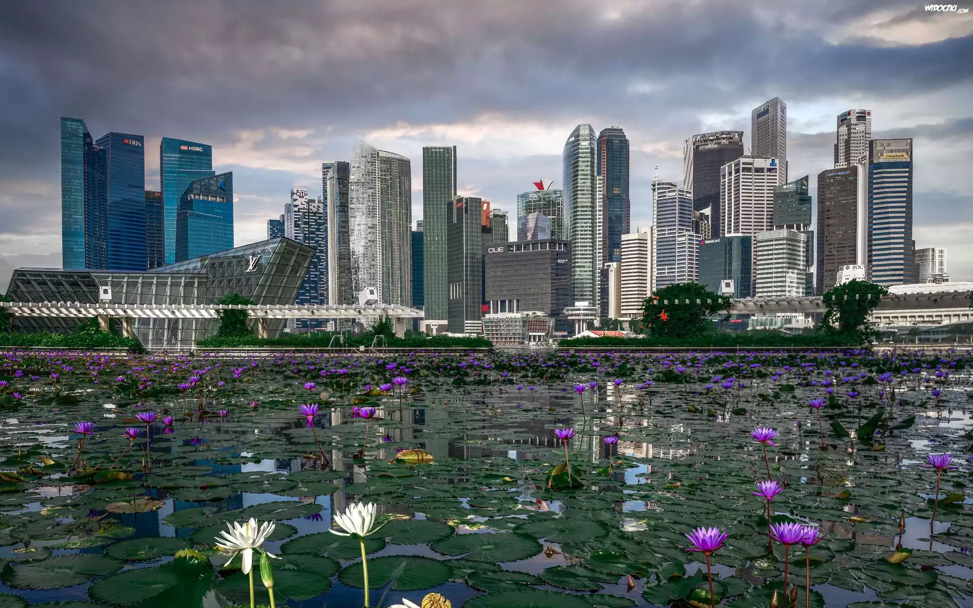 Zdjęcia, Drapacze chmur, Staw, Lilie wodne, Singapur