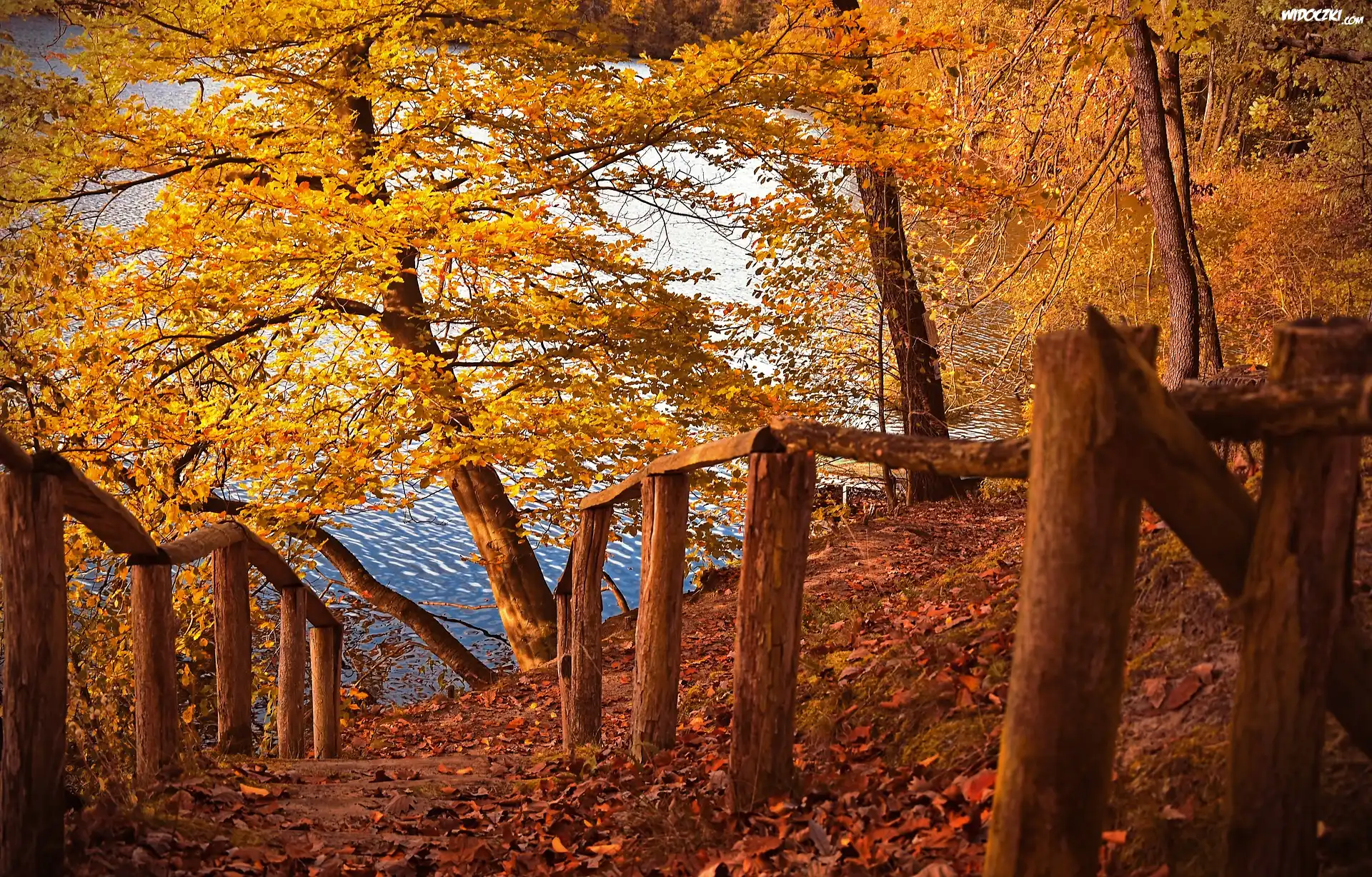 Drzewa, Liściaste, Jesień, Liście, Ogrodzenie, Balustrada, Jezioro