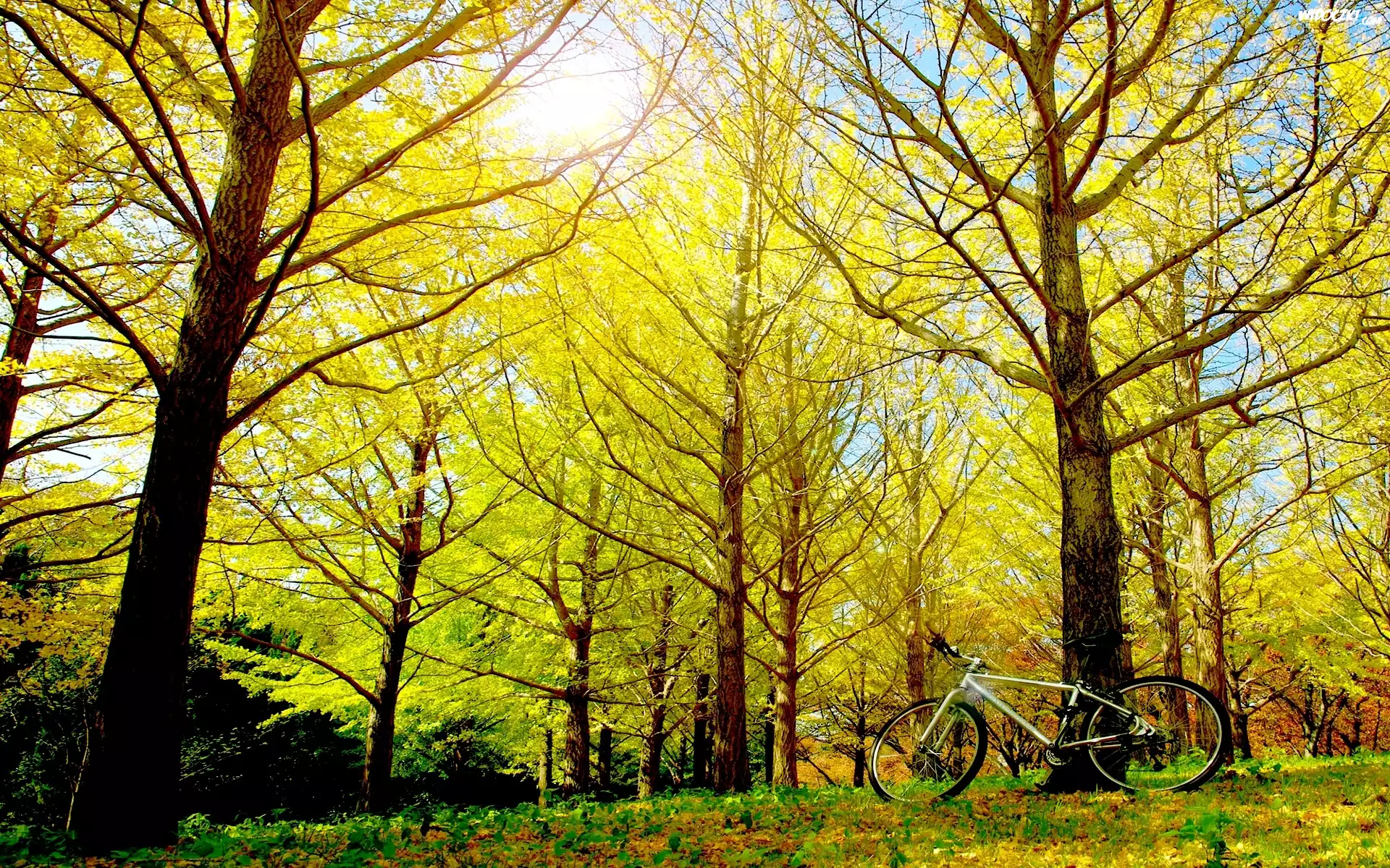 Zdjęcia, Las, Liściasty, Rower, Oparty, O, Drzewo, Promienie, Słońca