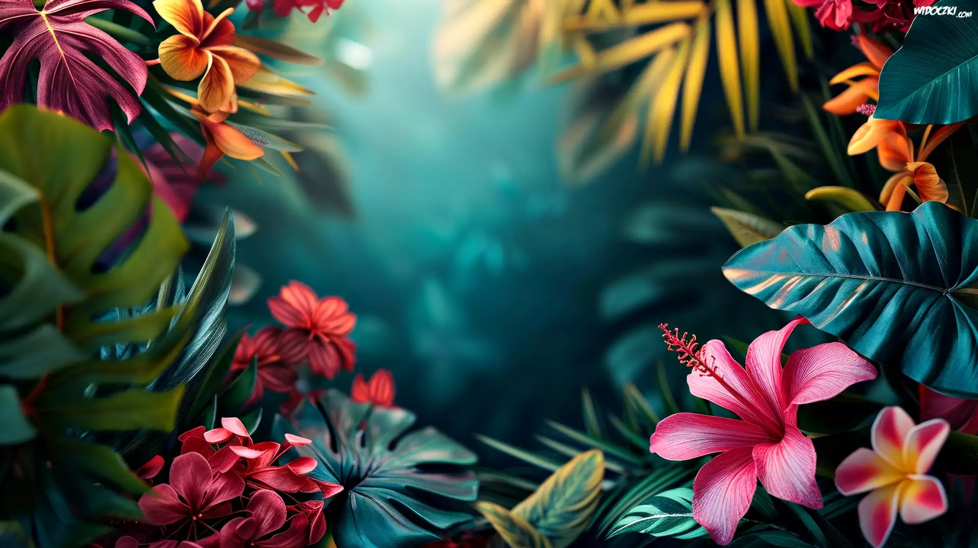 Zdjęcia, Dżungla, Kolorowe, Kwiaty, Liście, Światło, Grafika