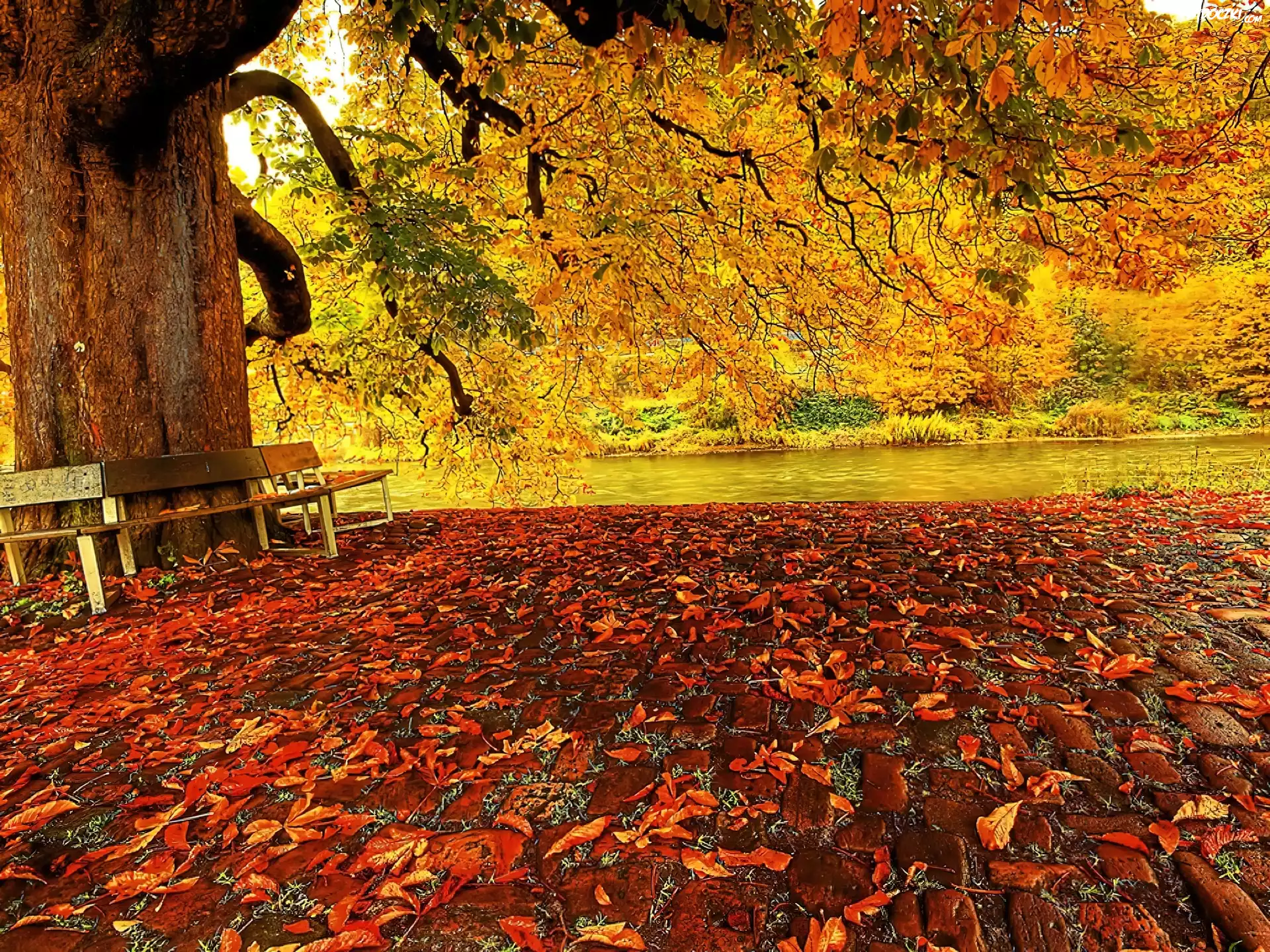 Zdjęcia, Jesień, Liście, Ławka