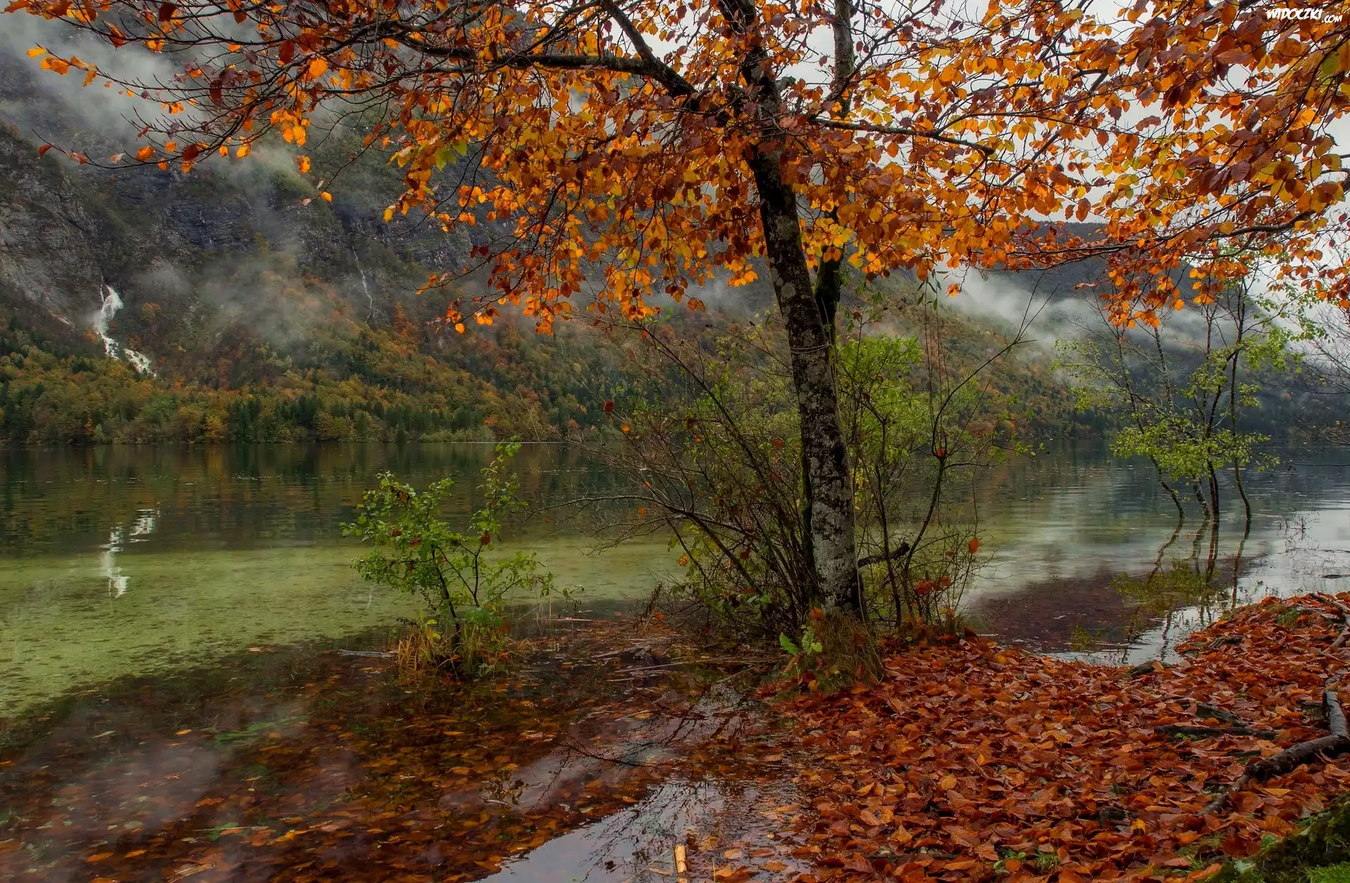 Zdjęcia, Słowenia, Park Narodowy Triglav, Jesień, Drzewo, Góry, Jezioro Bohinjsko, Liście