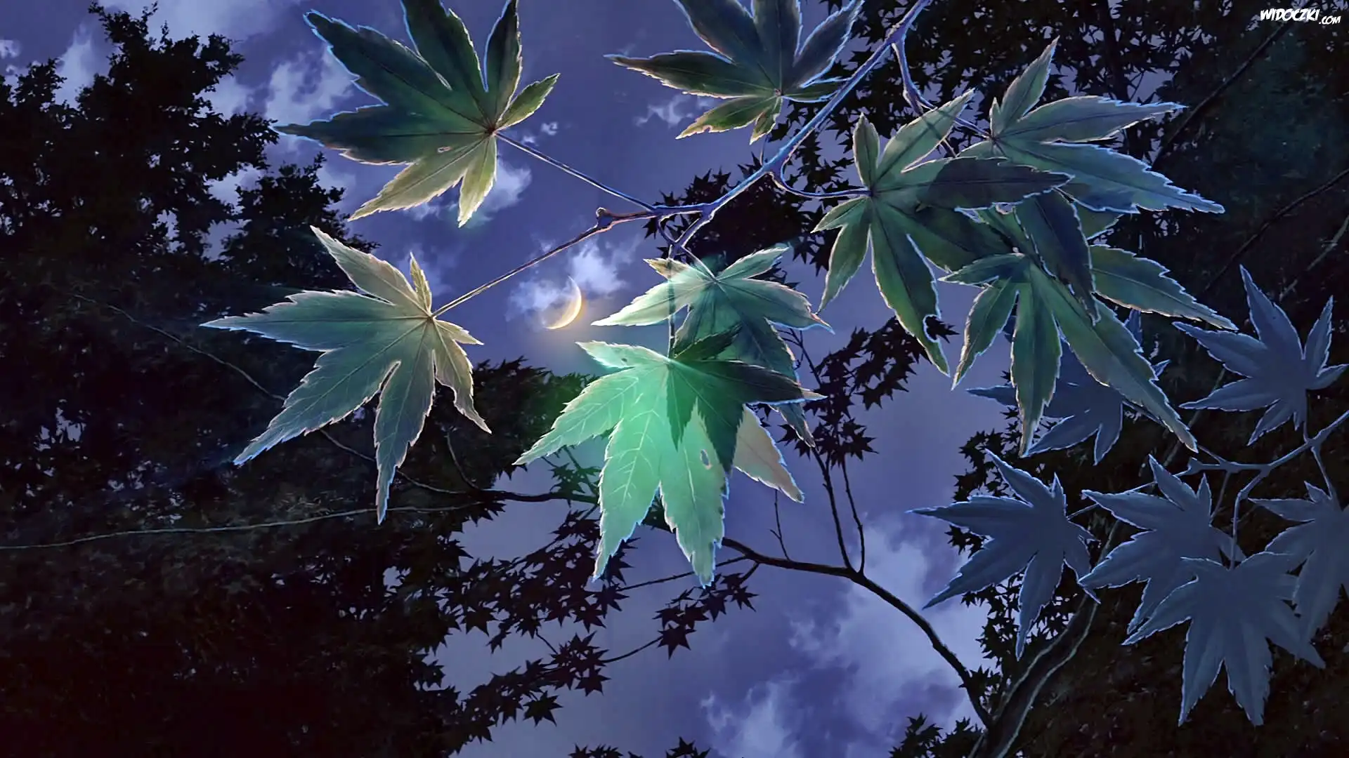 Liście, Niebo, Księżyc, Zmrok