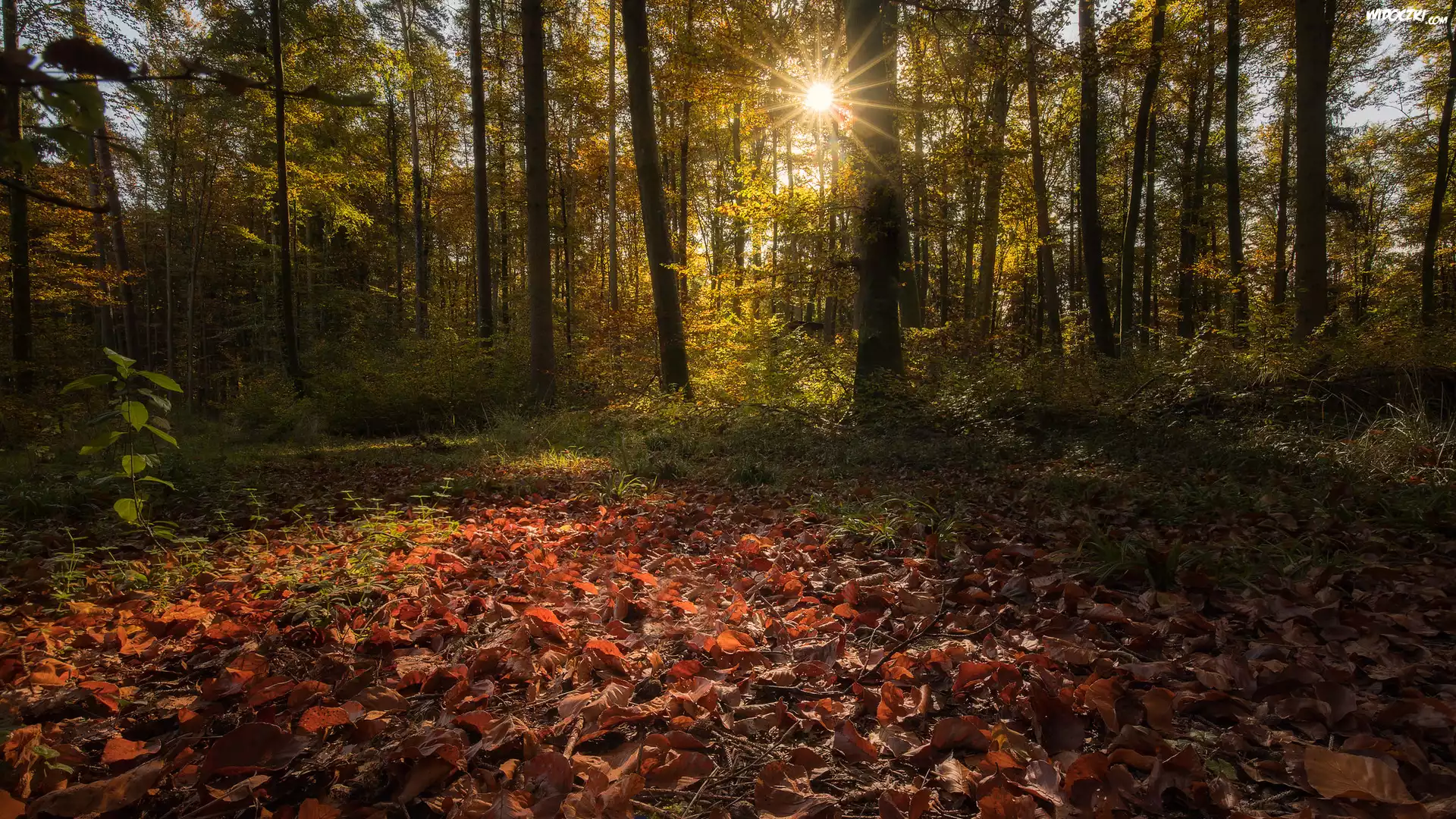 Las, Jesień, Opadłe, Liście, Drzewa, Promienie słońca