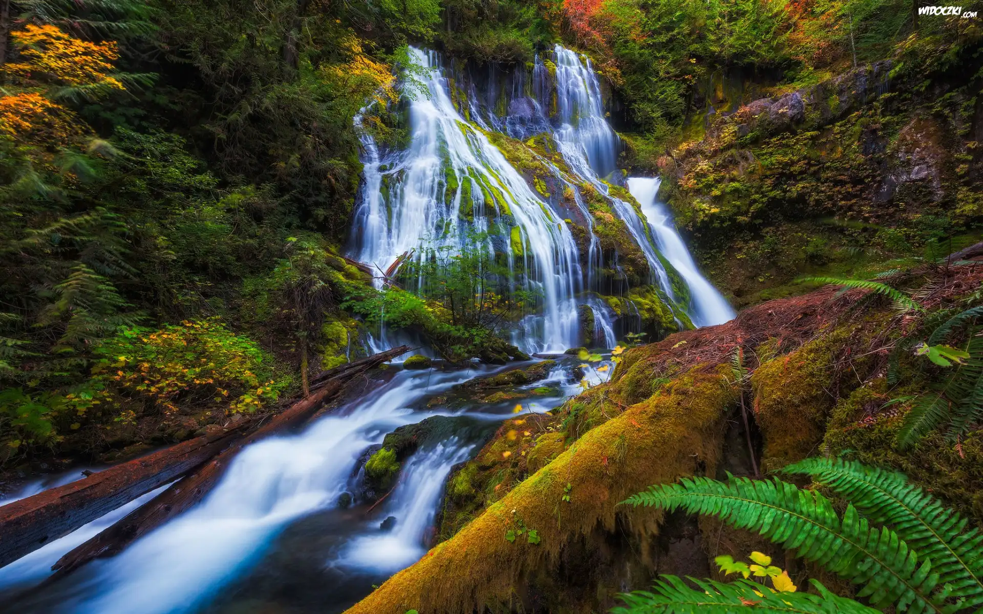 Zdjęcia, Jesień, Las, Roślinność, Wodospad, Strumień, Paproć, Skały, Liście