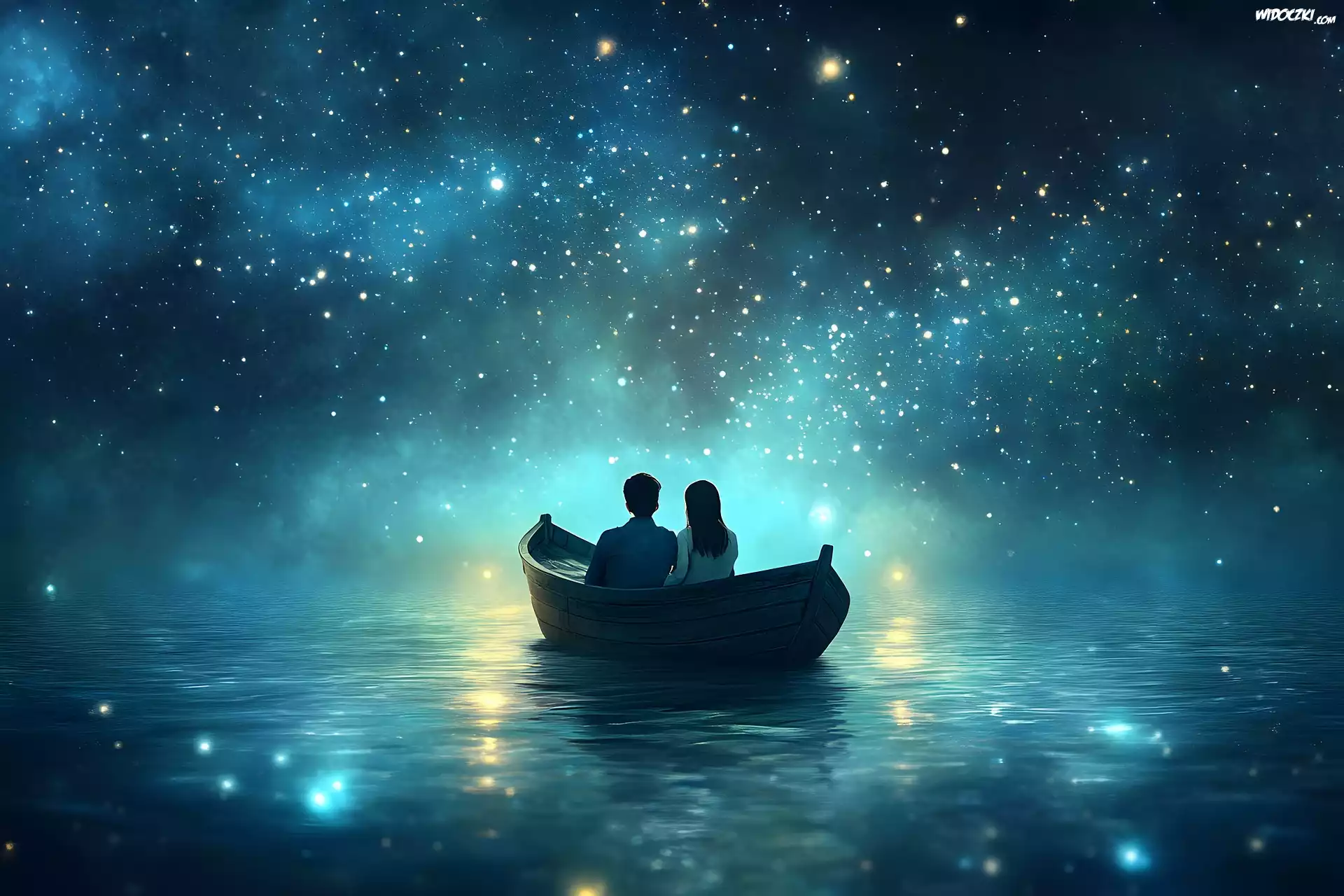 Jezioro, Łódka, Zakochani, Gwiazdy, Grafika