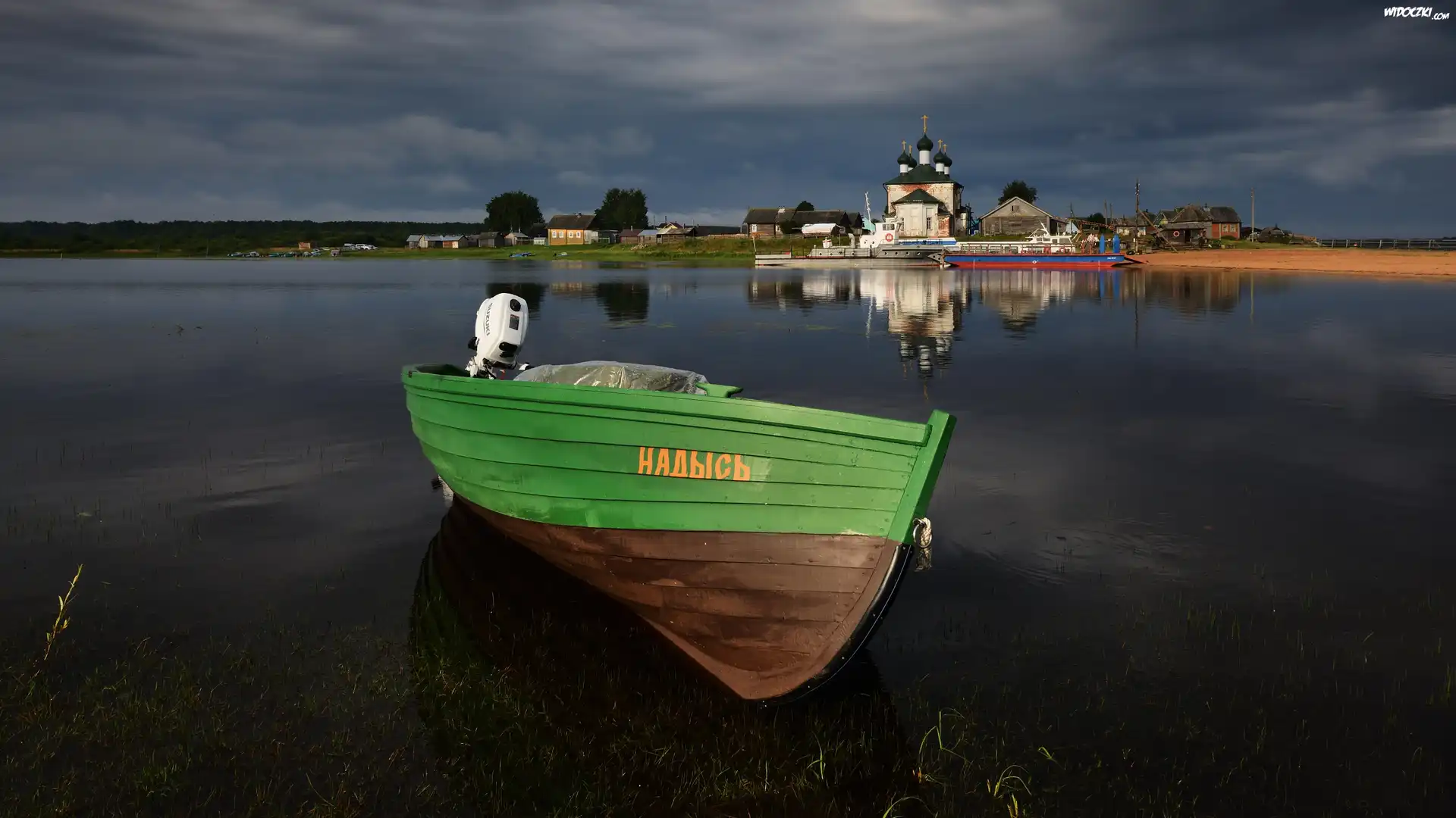 Zdjęcia, Rzeka, Łódź, Cerkiew, Drzewa, Chmury