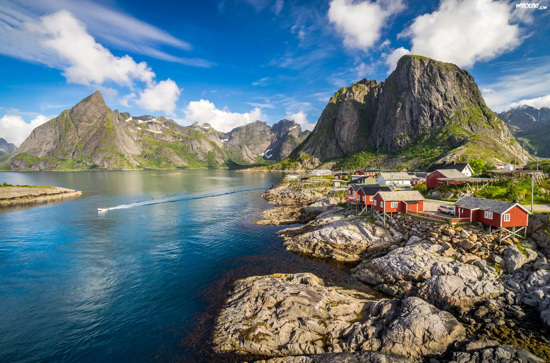 Zdjęcia, Norwegia, Lofoty, Góry, Skały, Wioska Reine, Domy, Chmury