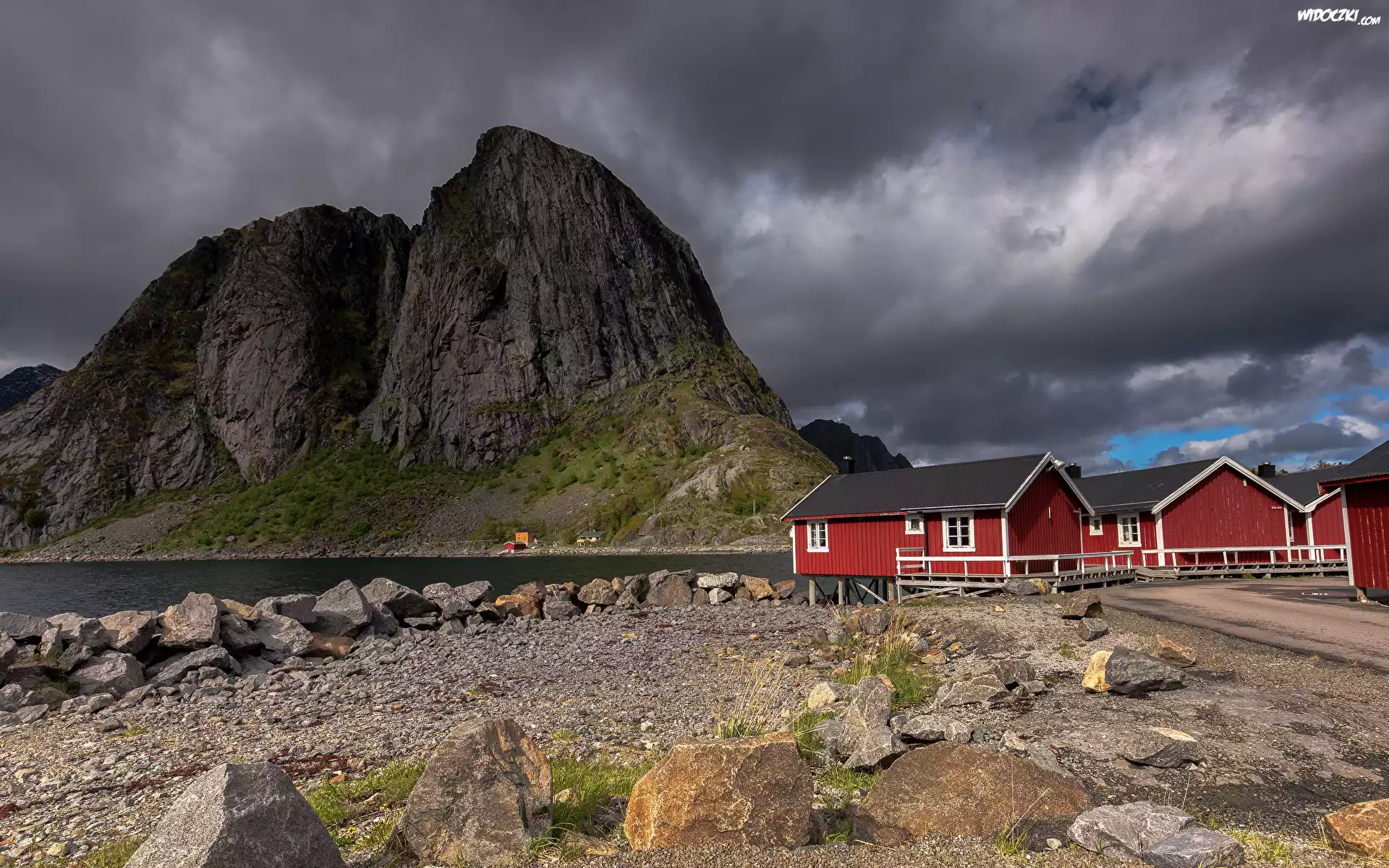 Zdjęcia, Norwegia, Lofoty, Góry, Czerwone, Domy