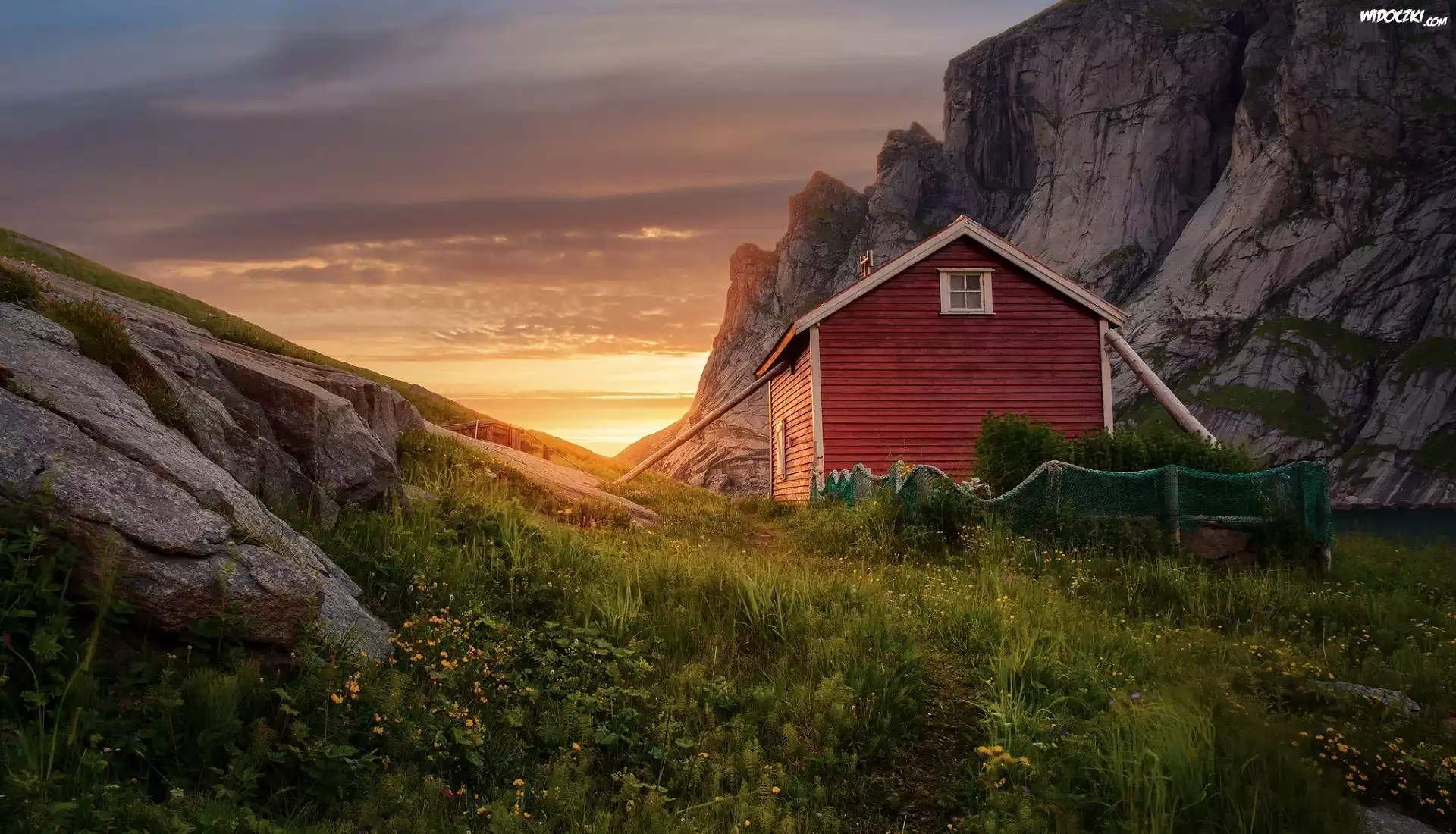 Norwegia, Lofoty, Wieś Reine, Dom, Zachód słońca, Góry