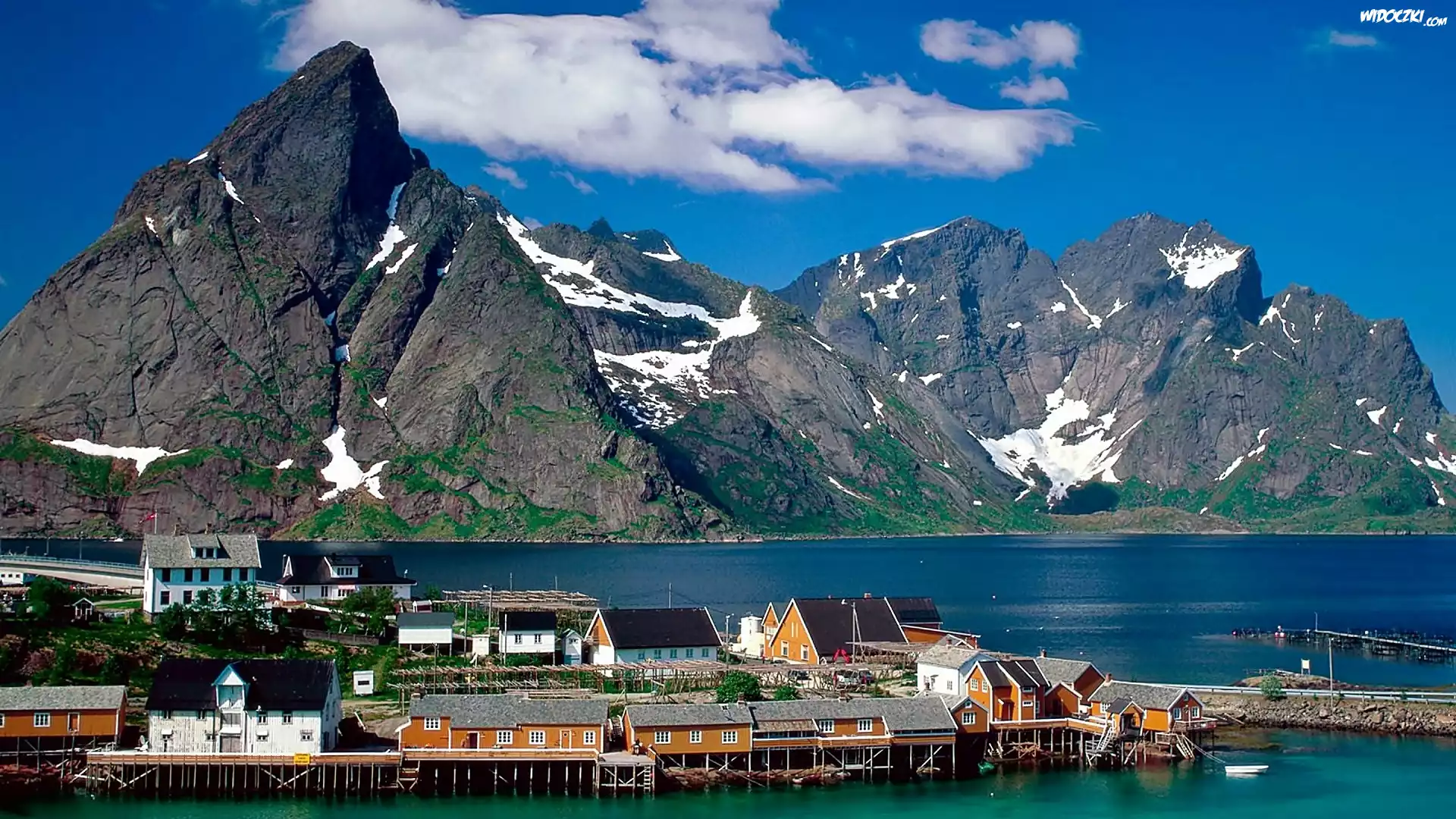 Lofoty, Wyspa, Sakrisoy, Domy, Góry, Morze