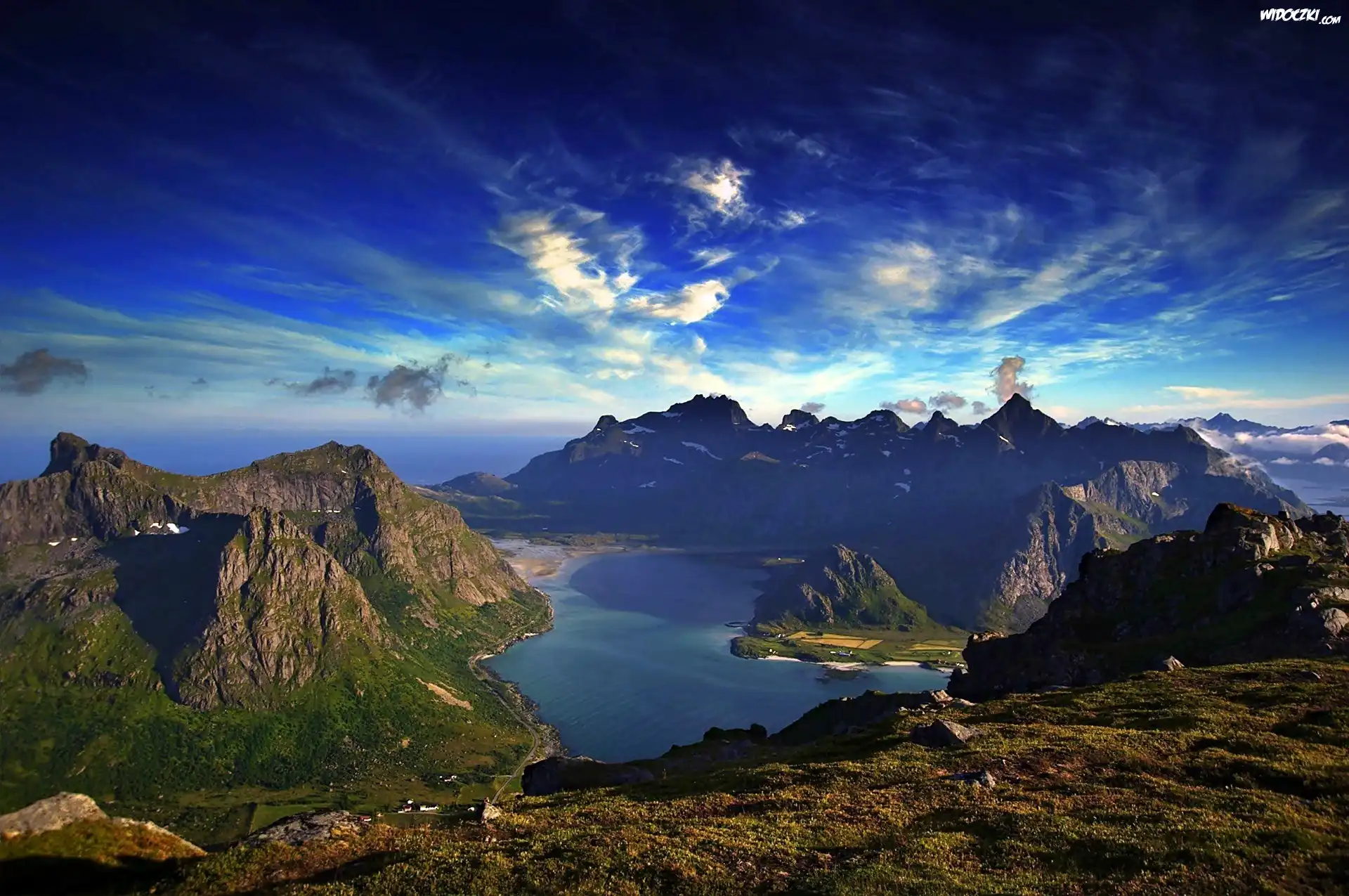 Lofoty, Chmury, Góry, Morze, Roślinność