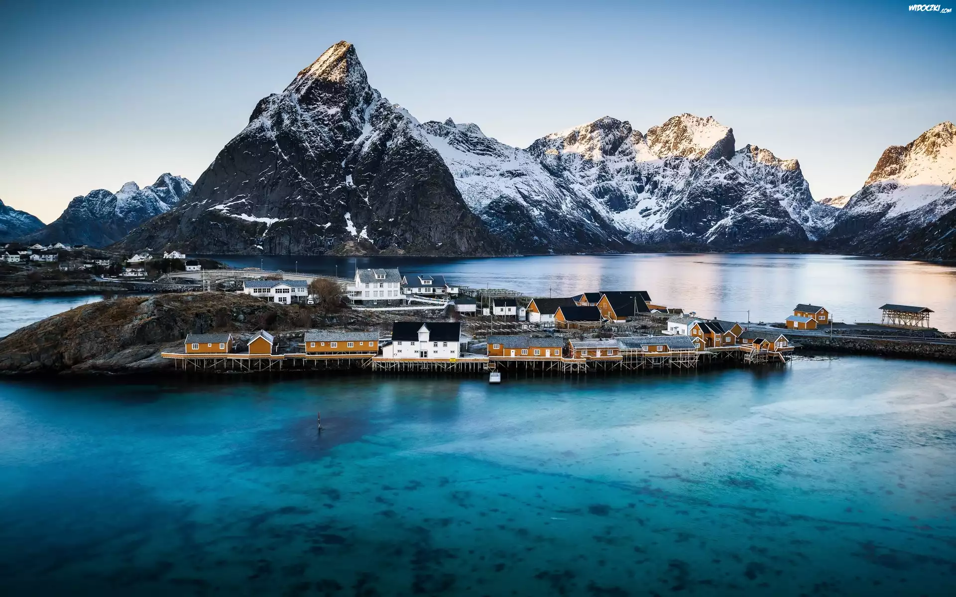 Zdjęcia, Norwegia, Lofoty, Wioska Reine, Domy, Góry, Morze, Zima