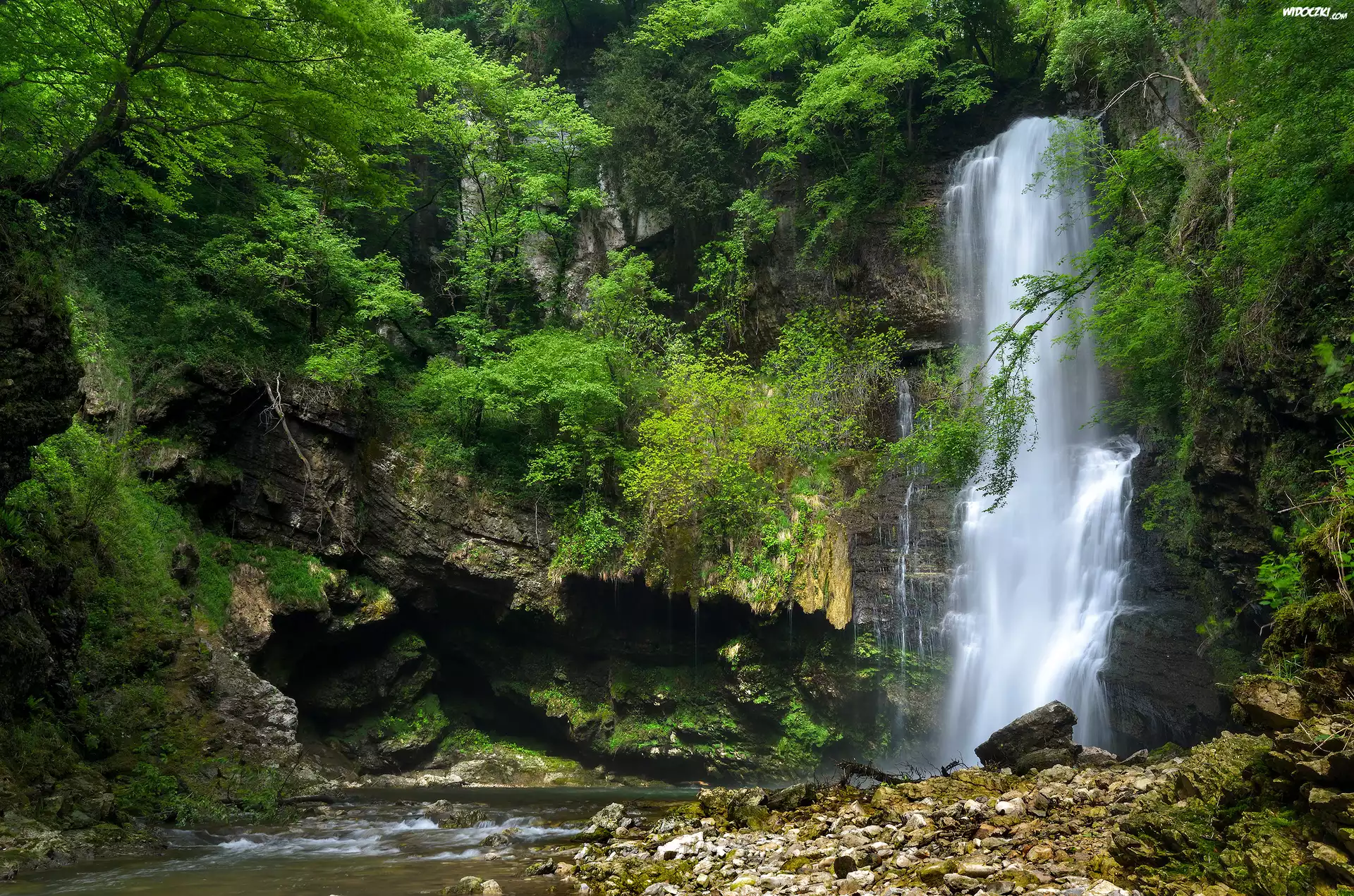 Zdjęcia, Włochy, Lombardia, Valganna, Wodospad Ferrera, Skały, Kamienie, Drzewa