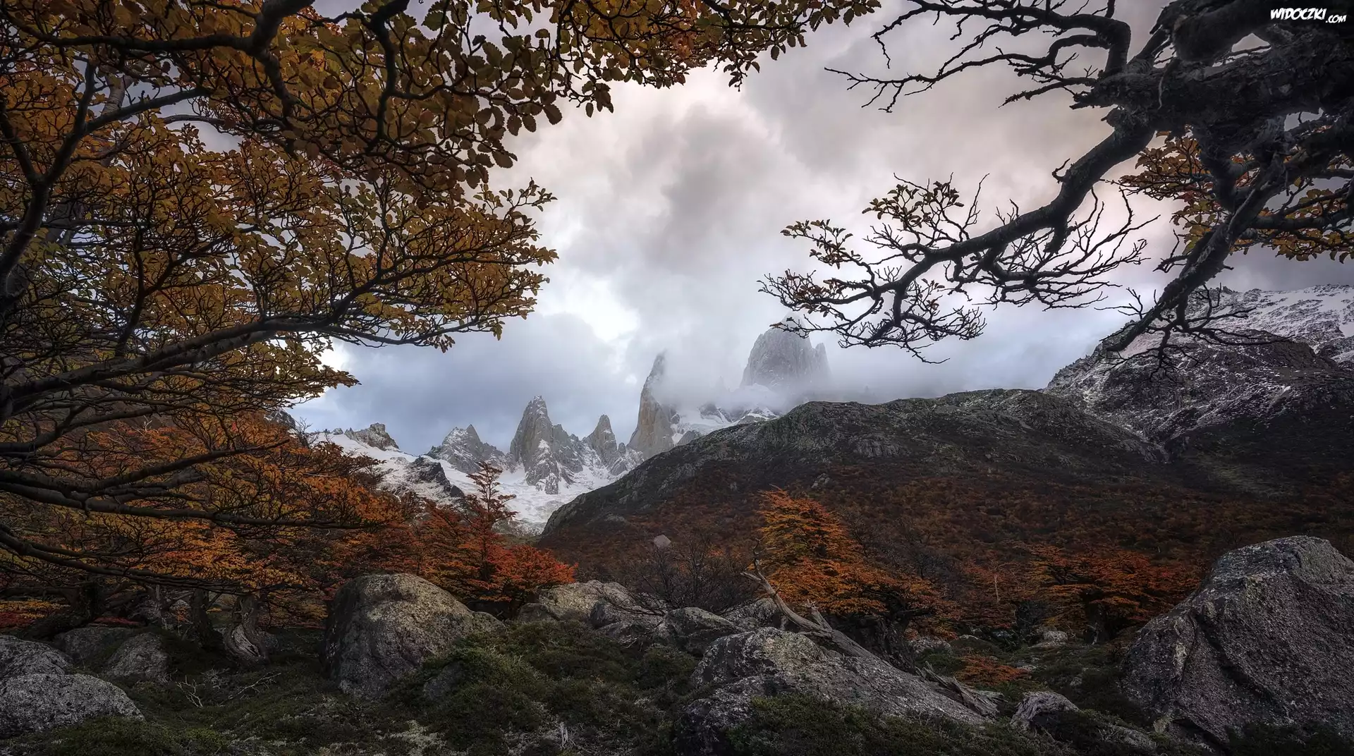 Zdjęcia, Jesień, Góry Andy, Park Narodowy Los Glaciares, Drzewa, Gałęzie, Kamienie, Patagonia, Argentyna