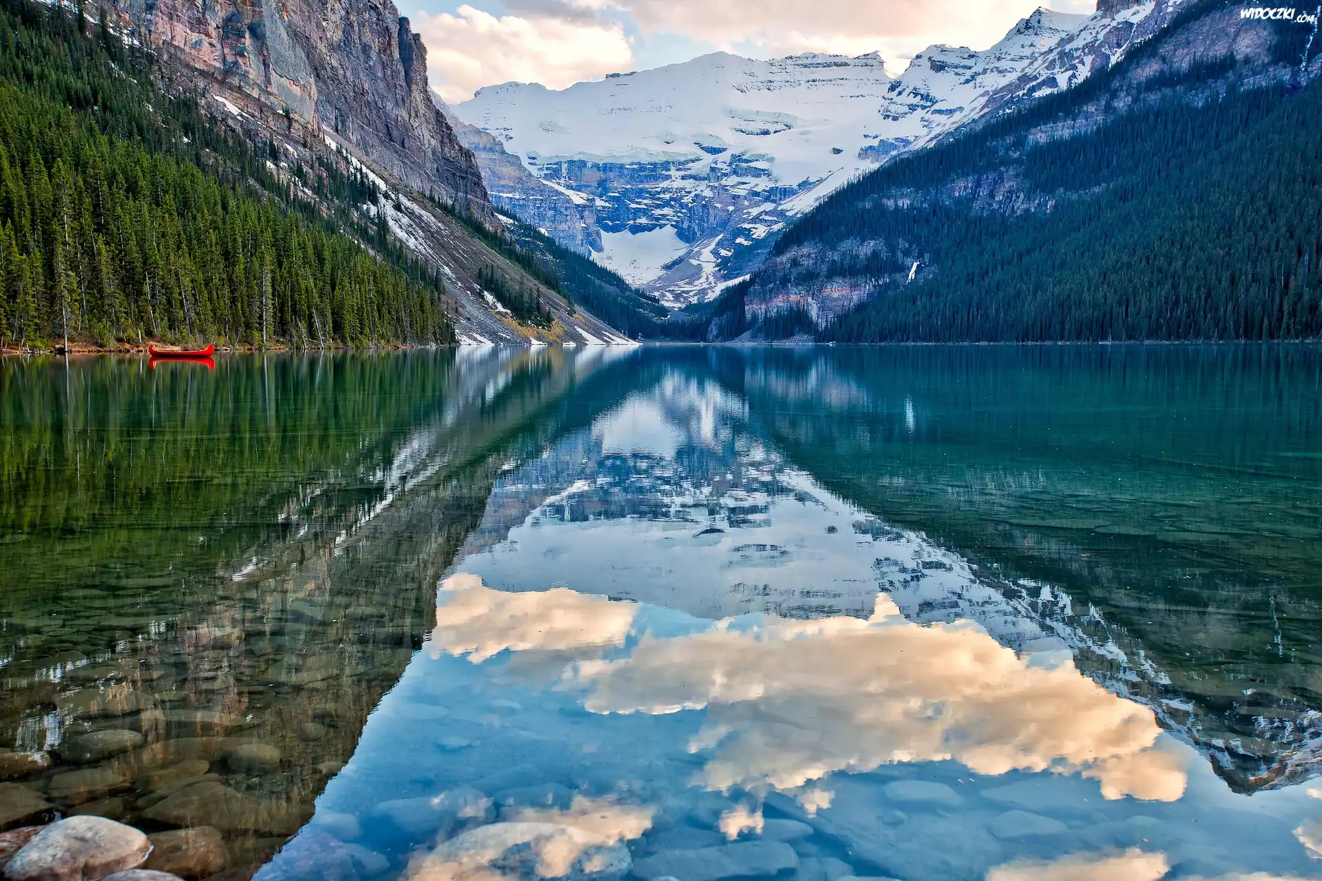 Zdjęcia, Jezioro Lake Louise, Park Narodowy Banff, Kanada, Góry, Odbicie, Chmury, Kajak
