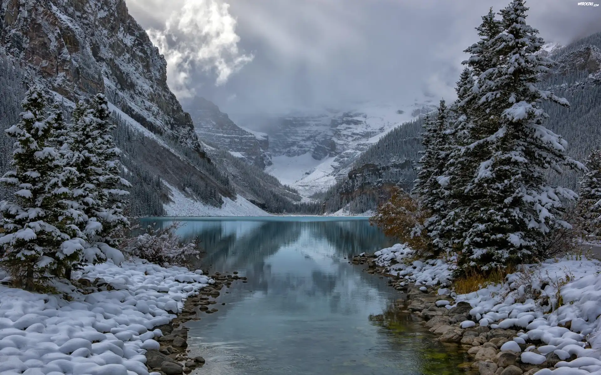 Zdjęcia, Park Narodowy Banff, Jezioro Lake Louise, Góry, Lasy, Chmury, Mgła, Zima, Kanada