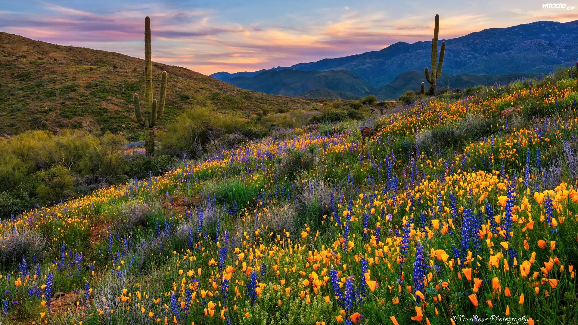 Zdjęcia, Wzgórza, Łąka, Kwiaty, Łubin, Maczki kalifornijskie, Kaktusy
