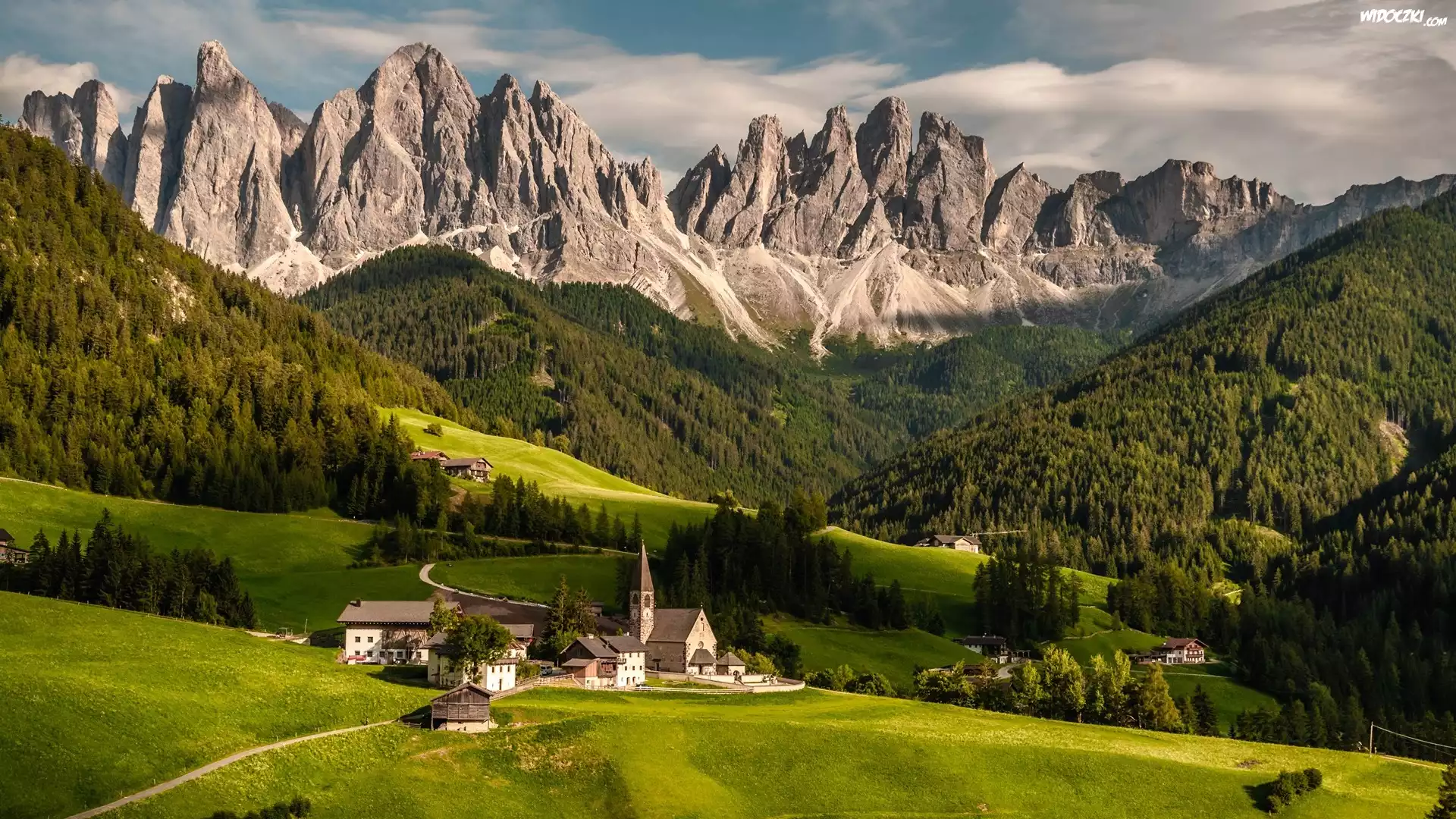 Góry, Dolomity, Wieś, Santa Maddalena, Dolina, Val di Funes, Drzewa, Lasy, Domy, Chmury, Włochy
