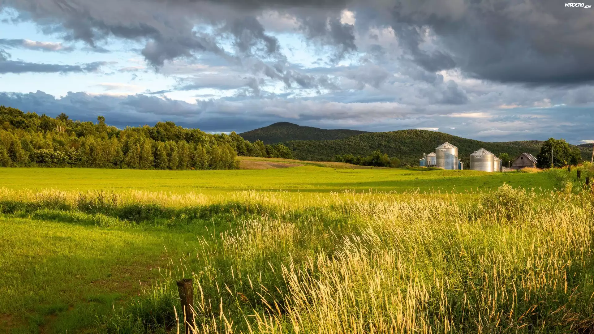 Zdjęcia, Pole, Trawa, Drzewa, Magazyn Zbożowy, Elewator, Wzgórza