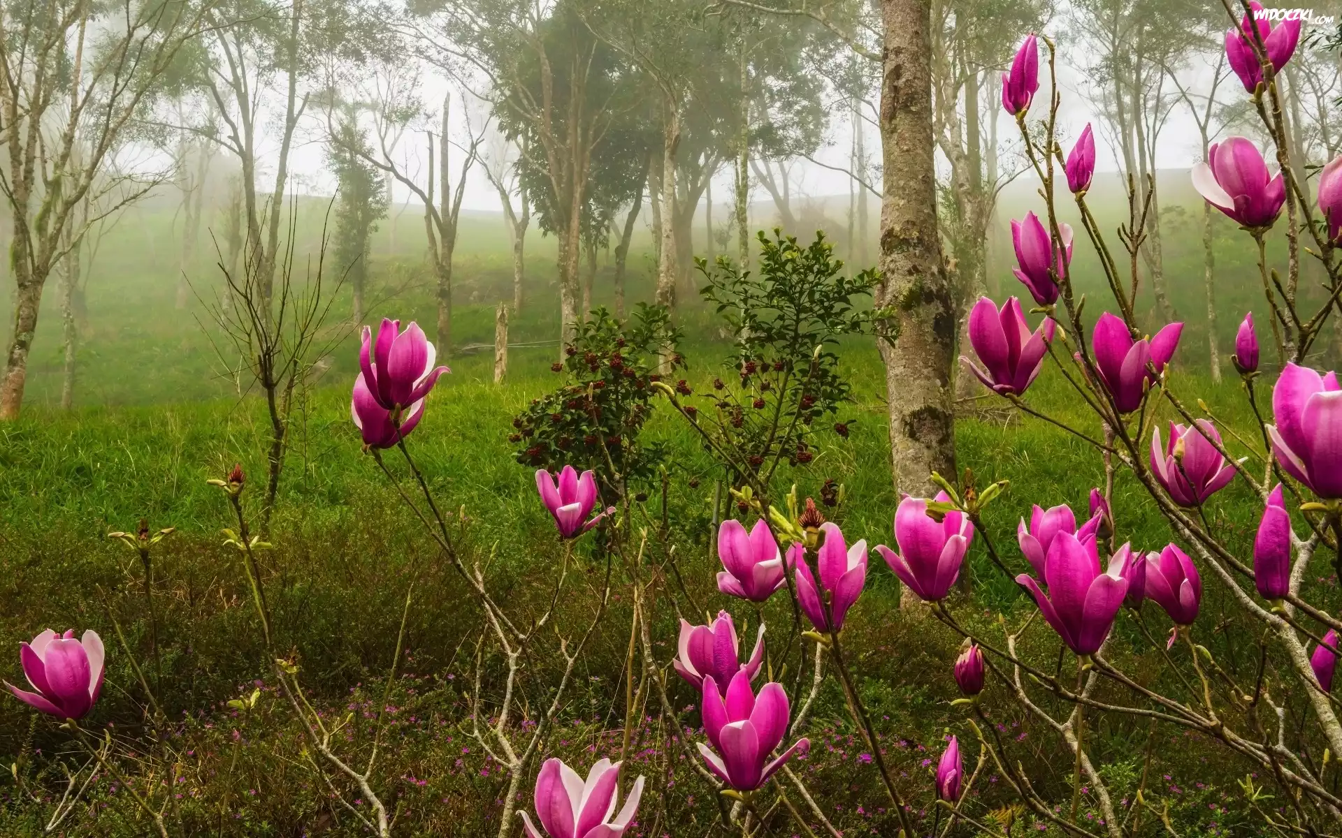Krzewy, Magnolia, fioletowa, Las, Brzozy, Mgła, Poranek