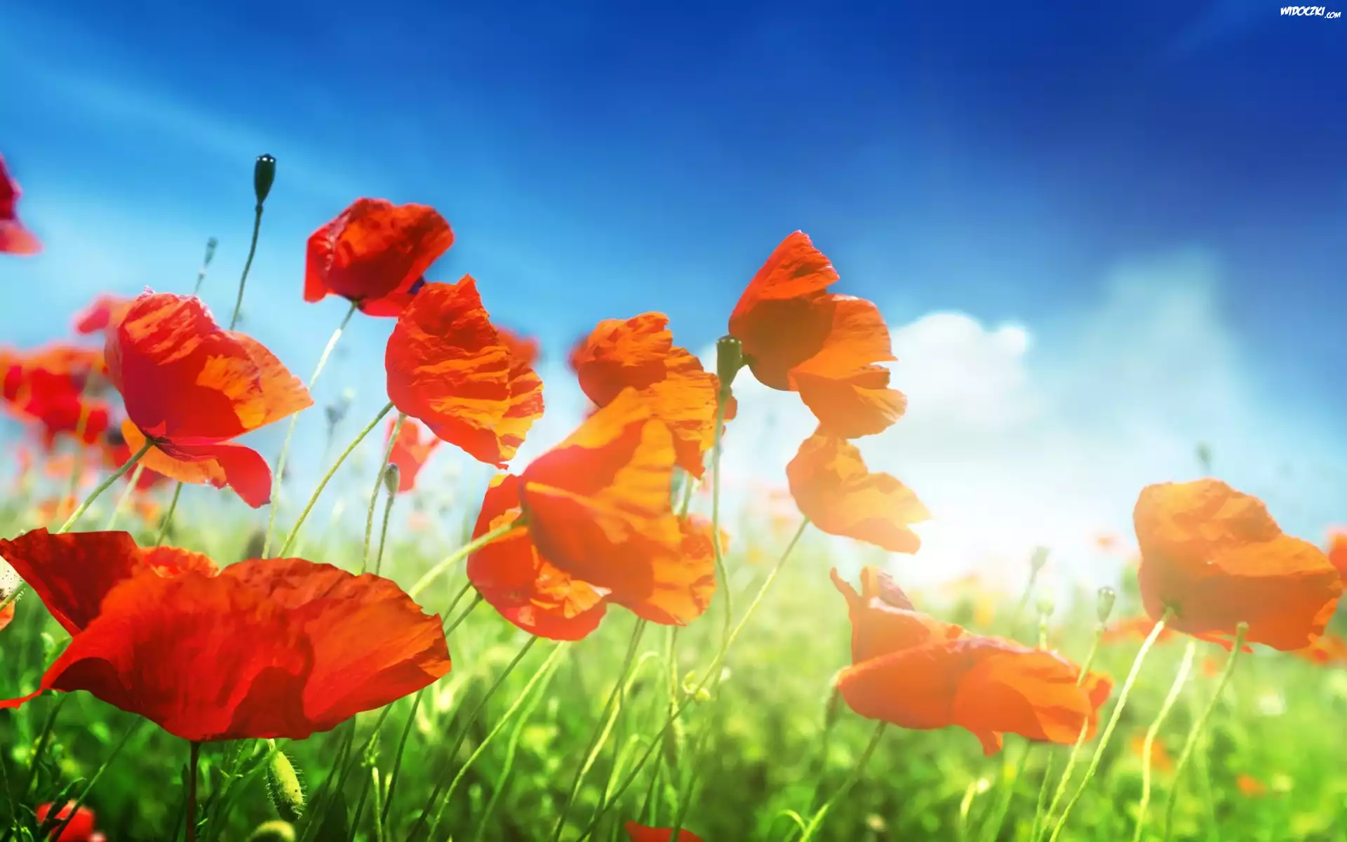 Zdjęcia, Maki, Łąka, Chmury, Trawy