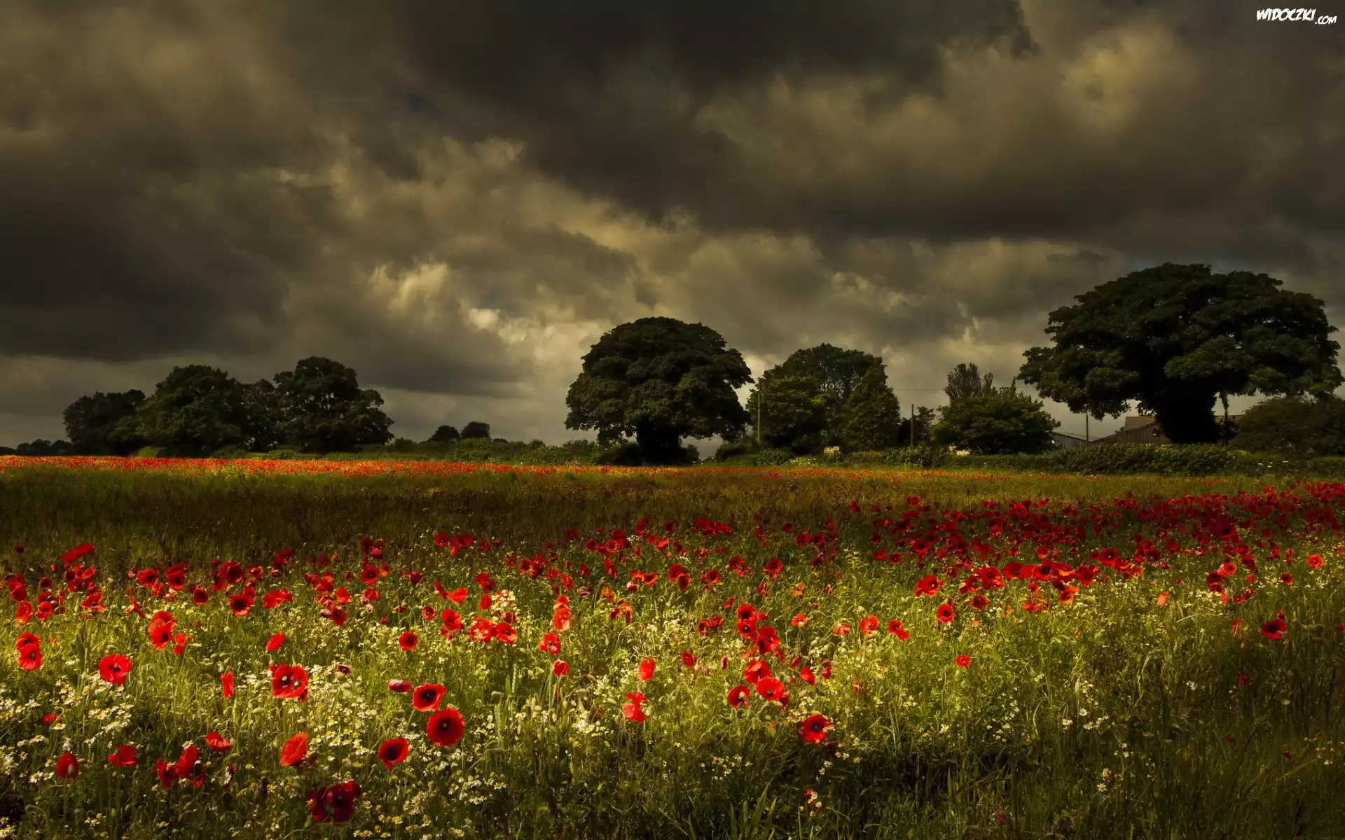 Zdjęcia, Łąka, Drzewa, Kwiaty, Maki, Chmury