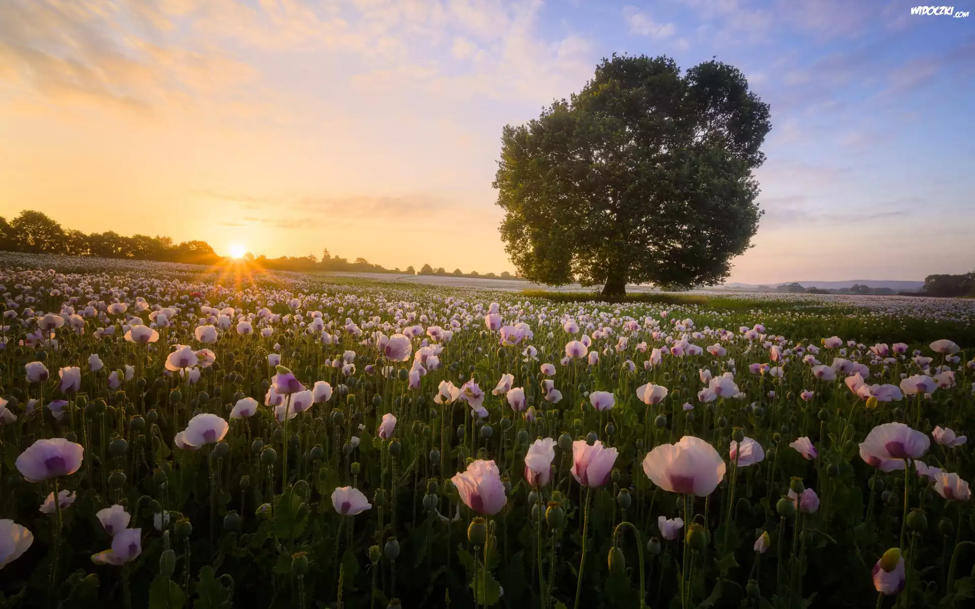 Zdjęcia, Pole, Maki, Drzewo, Wschód słońca