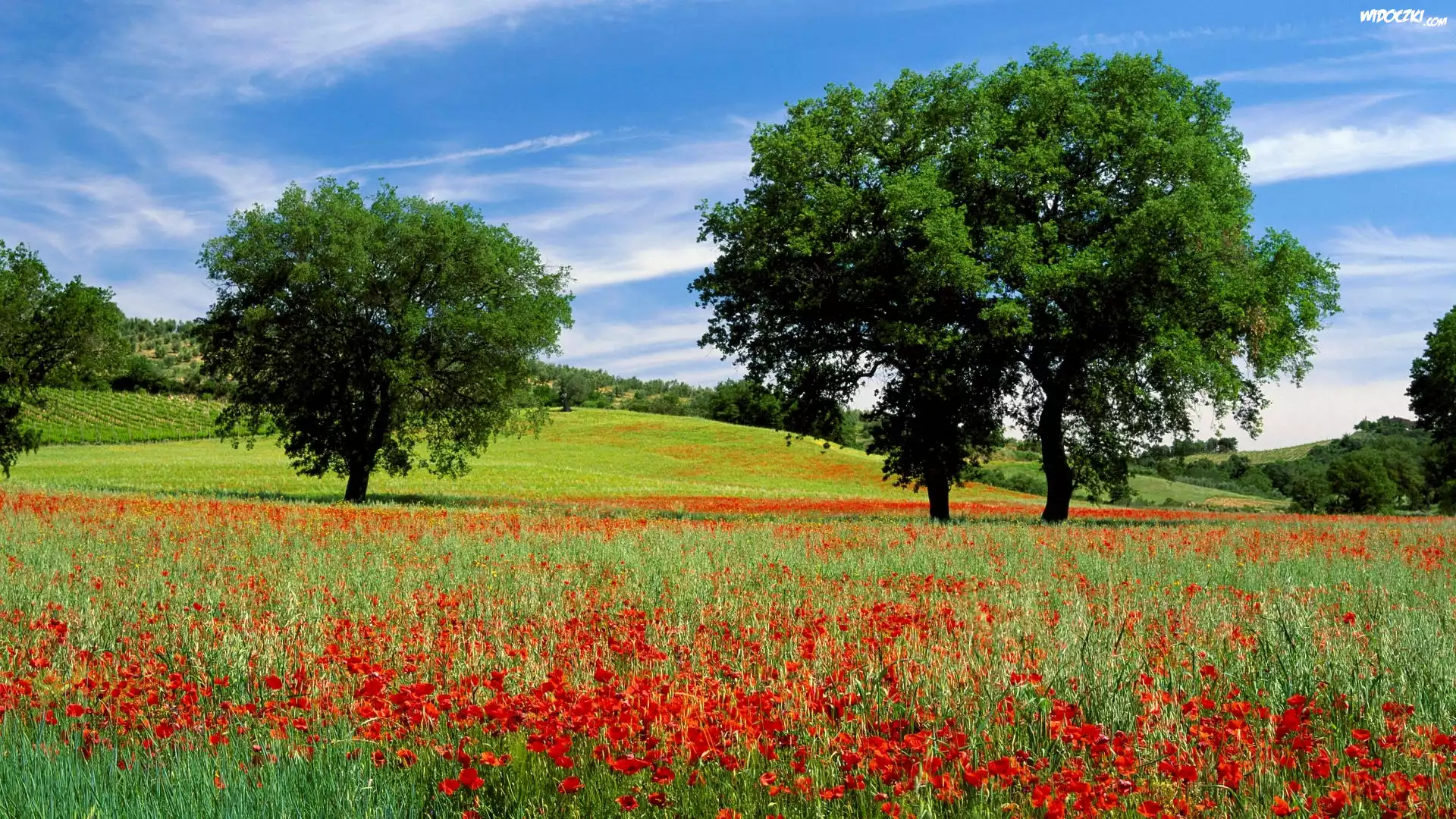 Zdjęcia, Łąka, Kwiaty, Maki, Drzewa