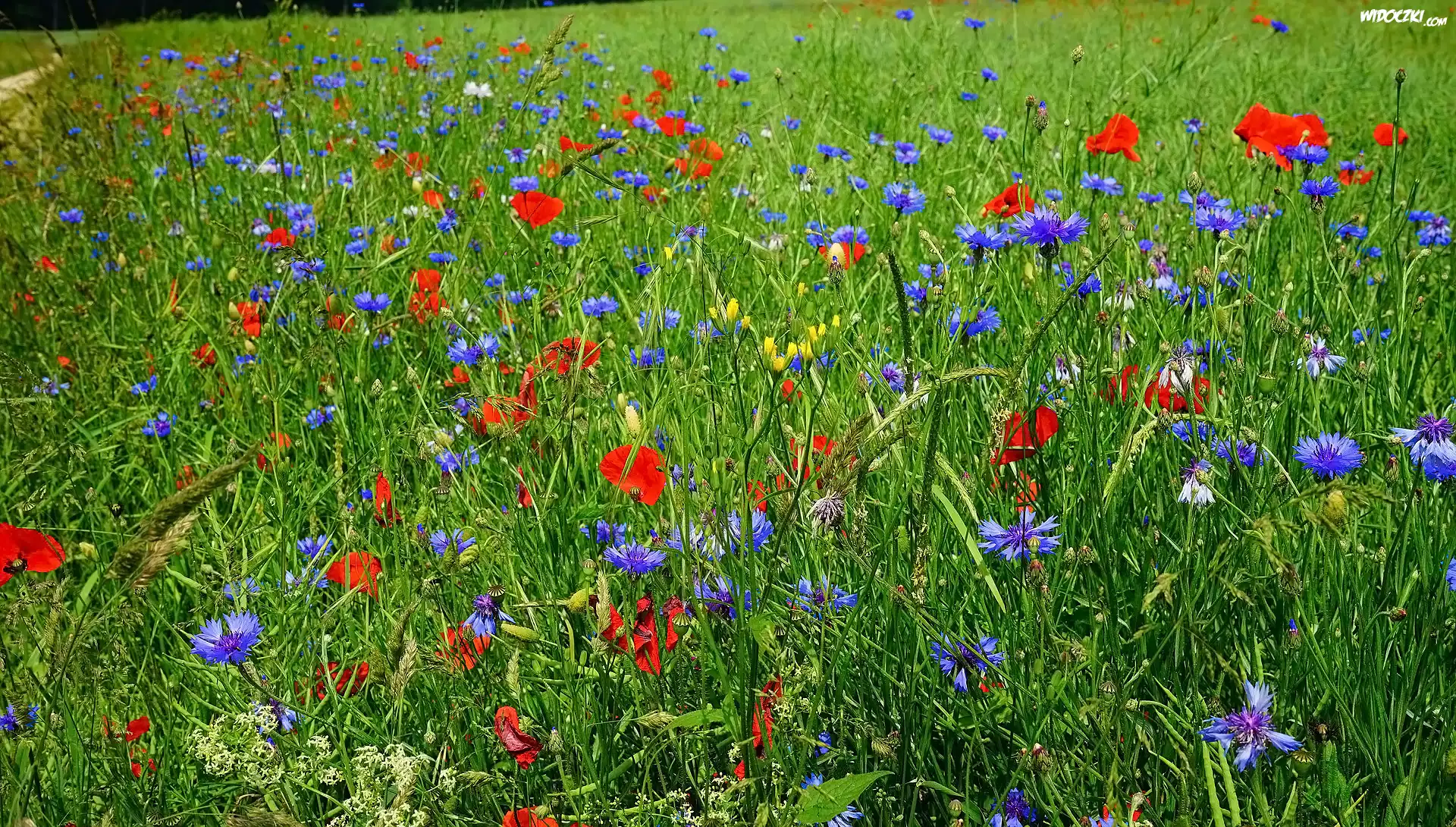 Zdjęcia, Łąka, Kwiaty, Chabry, Maki, Trawa