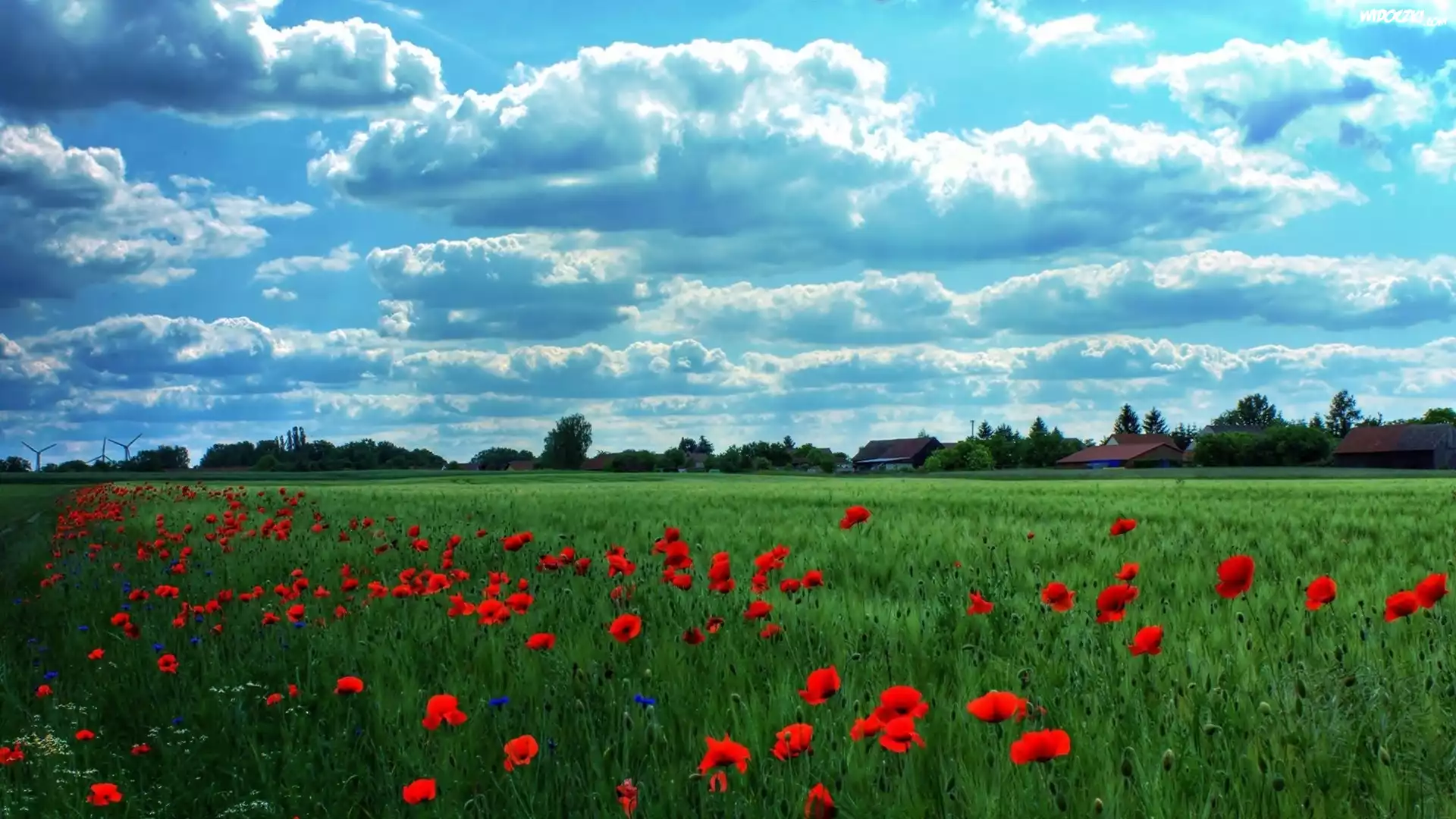 Pole, Maki, Farmy, Wiatraki, Chmury, Wioska, Krajobraz