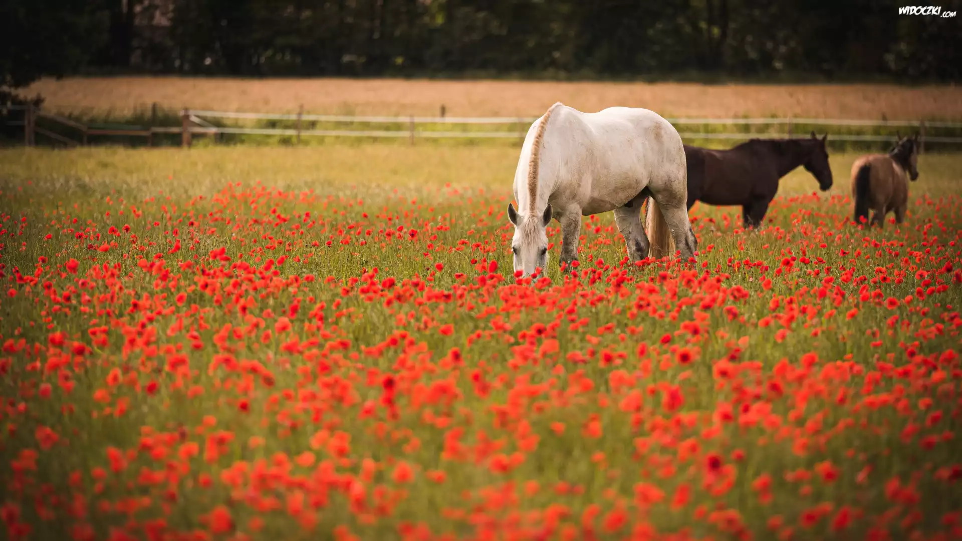 Trzy, Konie, Łąka, Maki