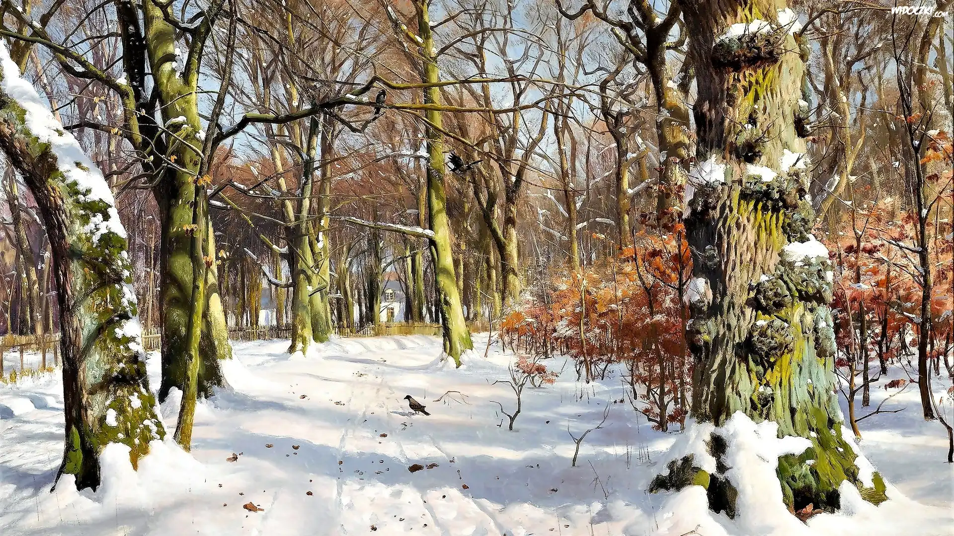 ZdjÄ™cia, Malarstwo, Peder Mørk Mønsted, Obraz, W lesie Charlottenlund, Zima, Drzewa, Las