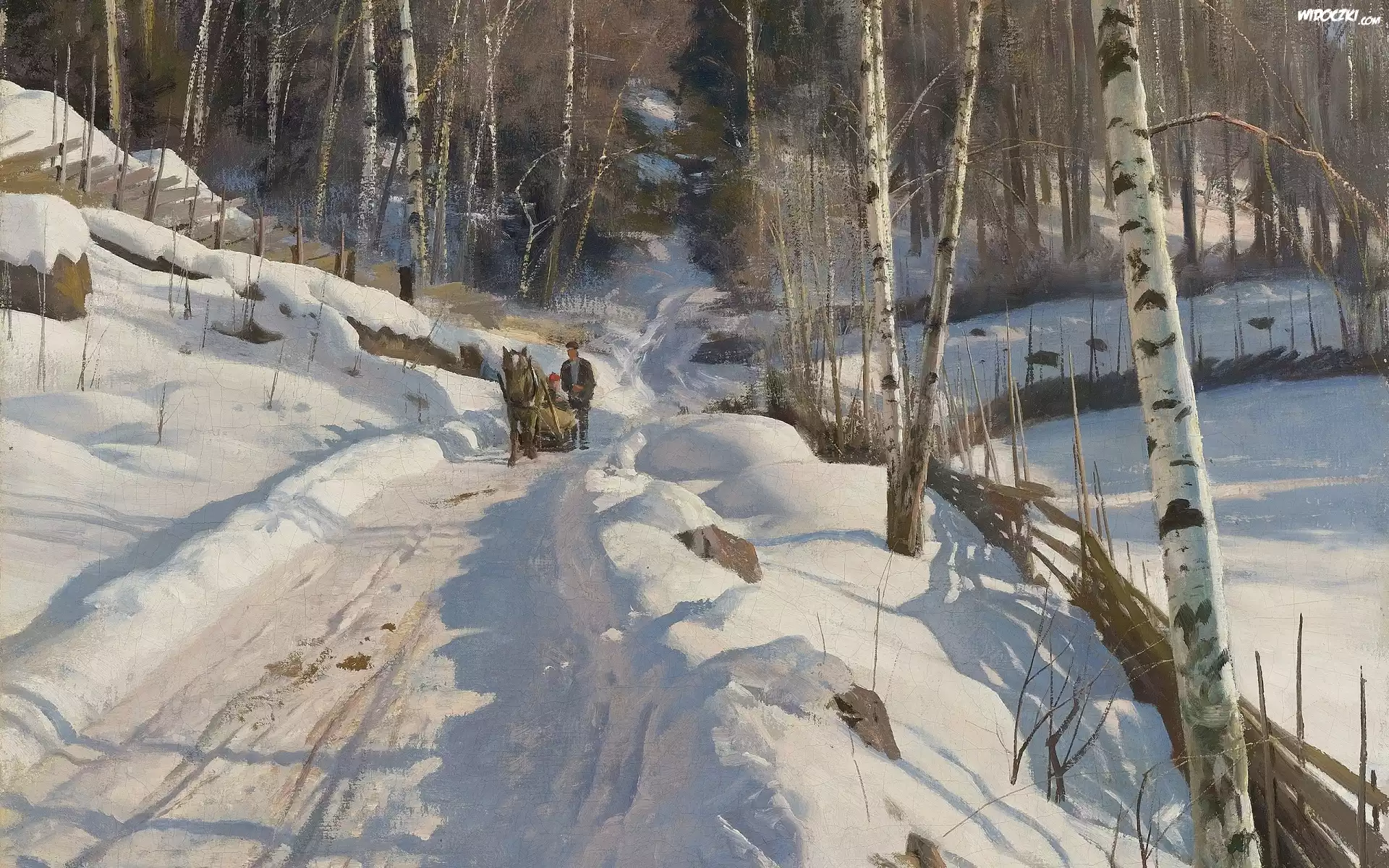 Malarstwo, Obraz, Zima, Koń, Sanie, Człowiek, Las, Drzewa, Brzozy, Droga, Ogrodzenie, Peder Monsted |