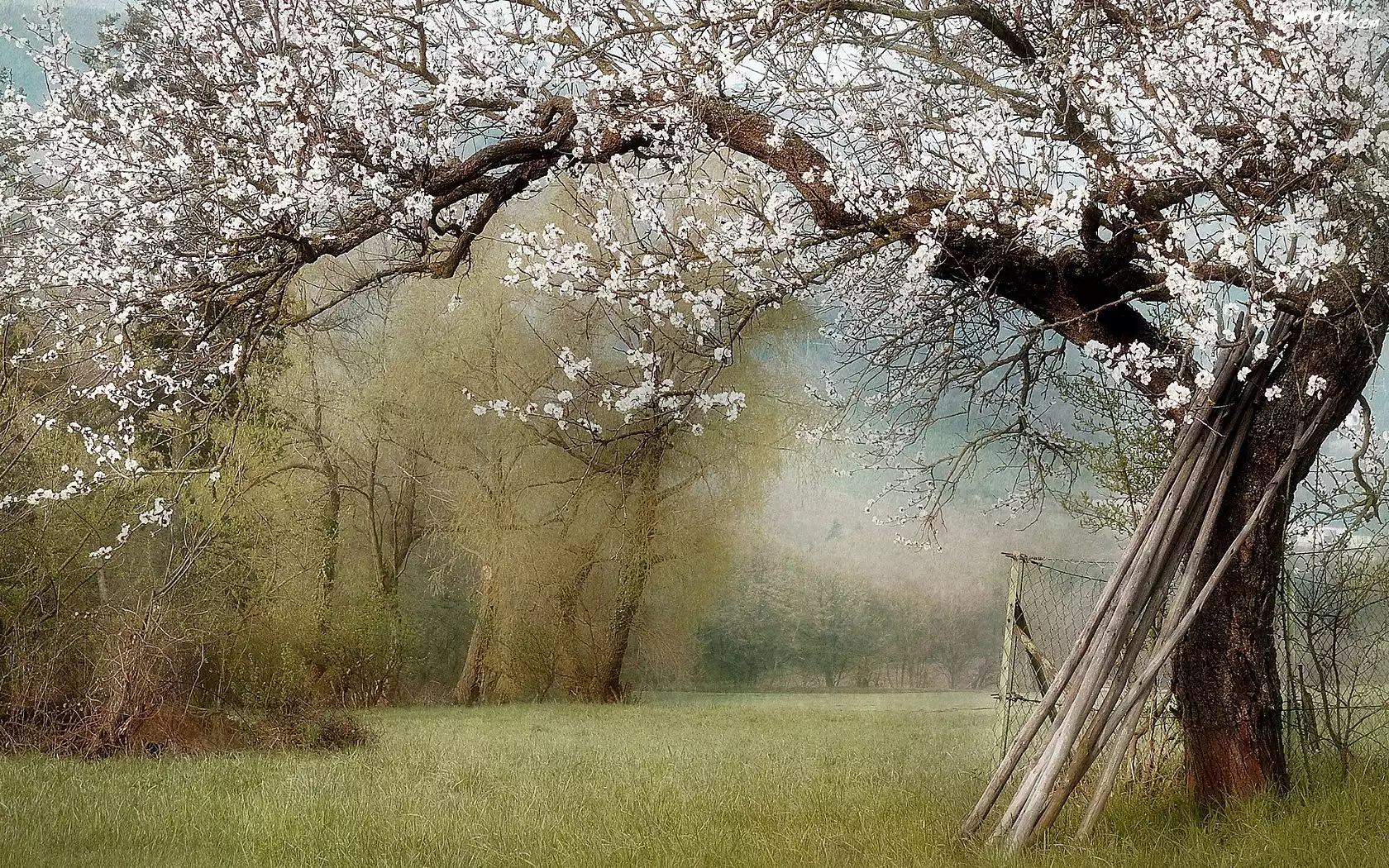 Zdjęcia, Malarstwo, Obraz, Ogródek, Drzewo, Okwiecone, Płotek