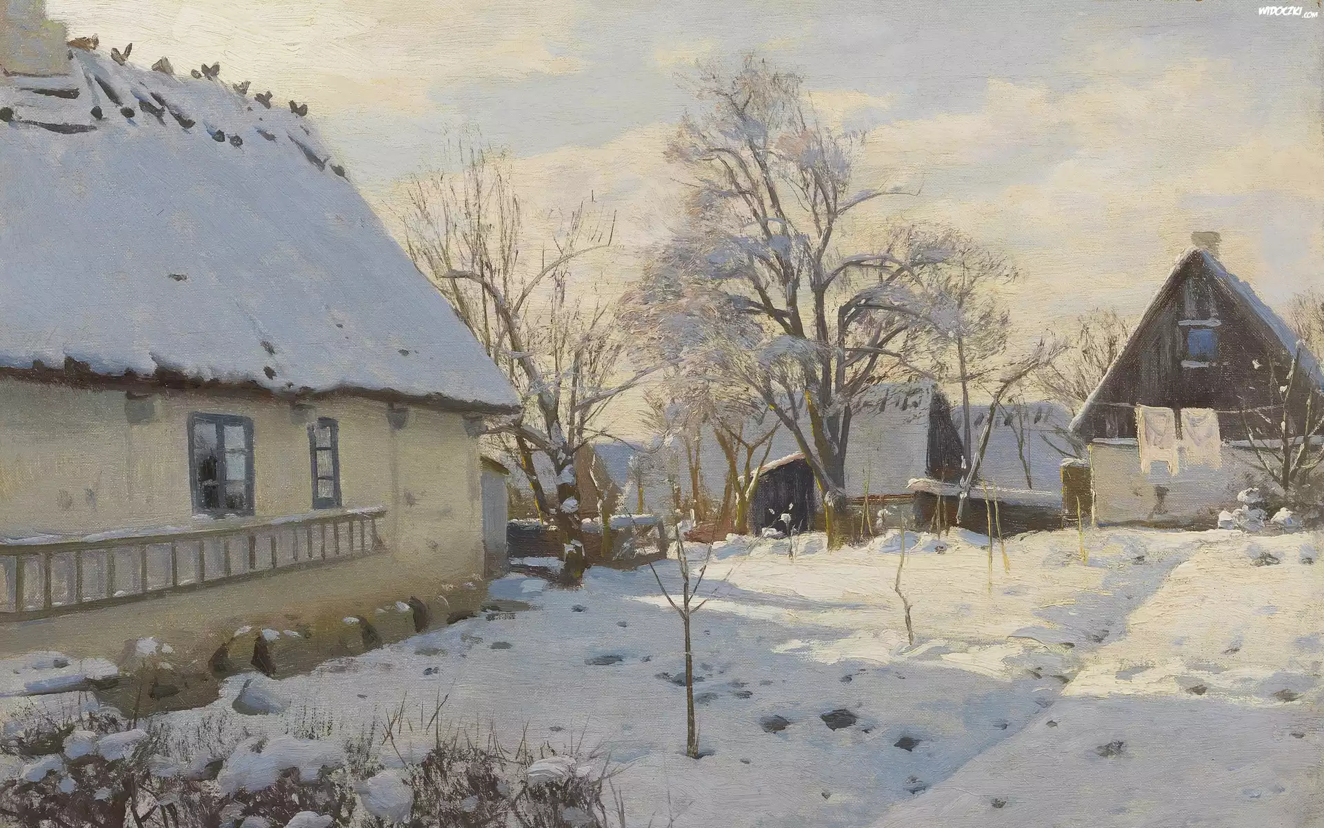 Zdjęcia, Malarstwo, Peder Monsted, Zima, Wieś, Domy