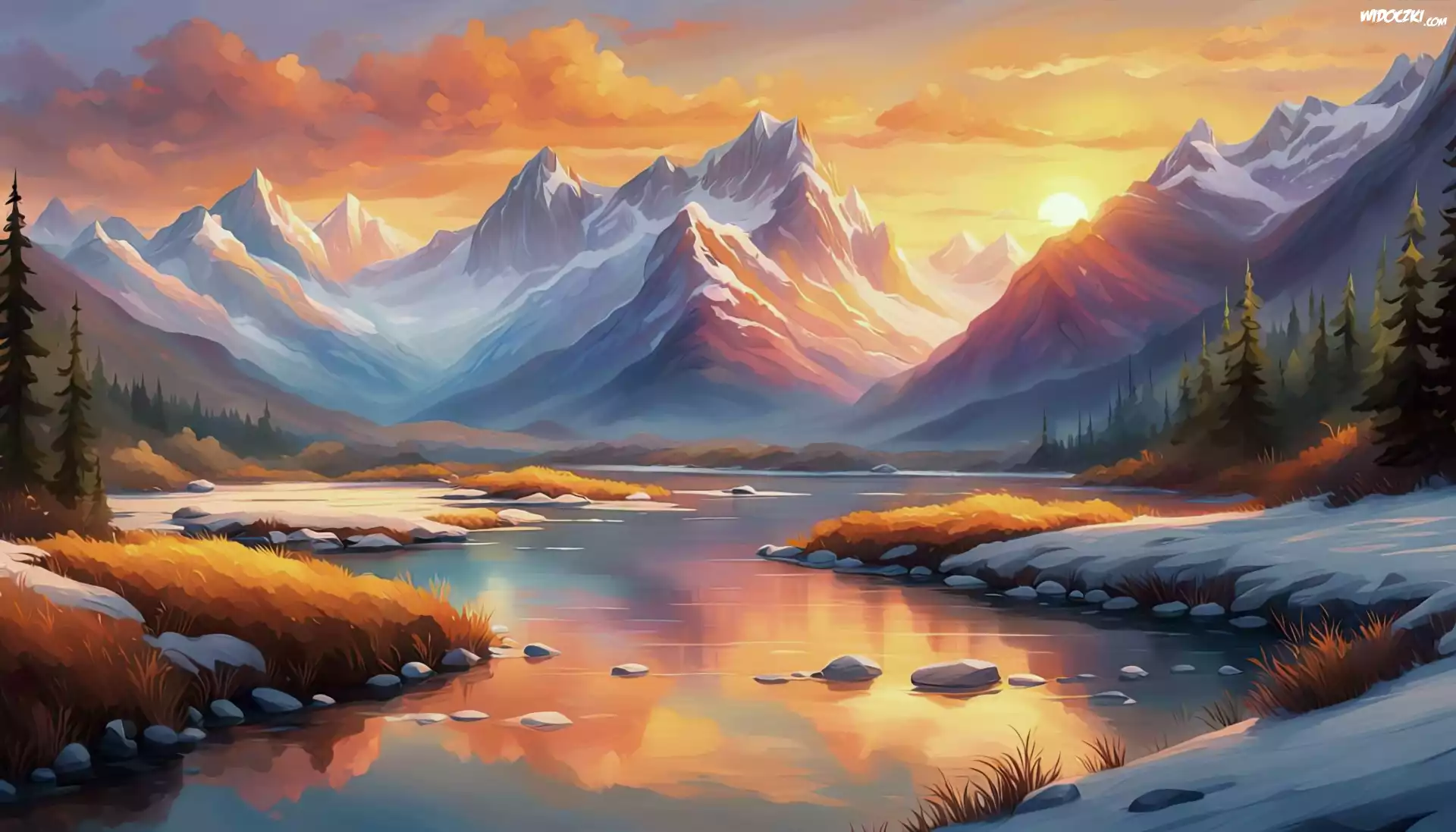 Zdjęcia, Malarstwo, Sztuka, Akwarela, Góra, Słońce, Woda, Niebo, Poranek, Wschód słońca