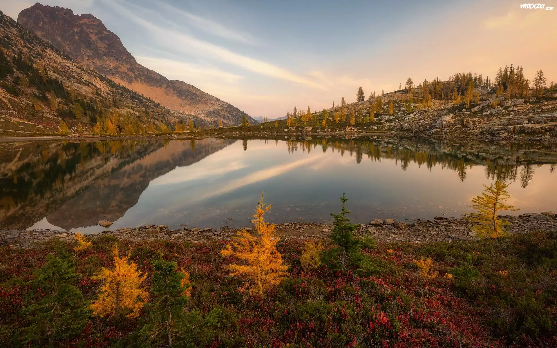 Góry, Jezioro, Drzewa, Małe, Modrzewie, Roślinność