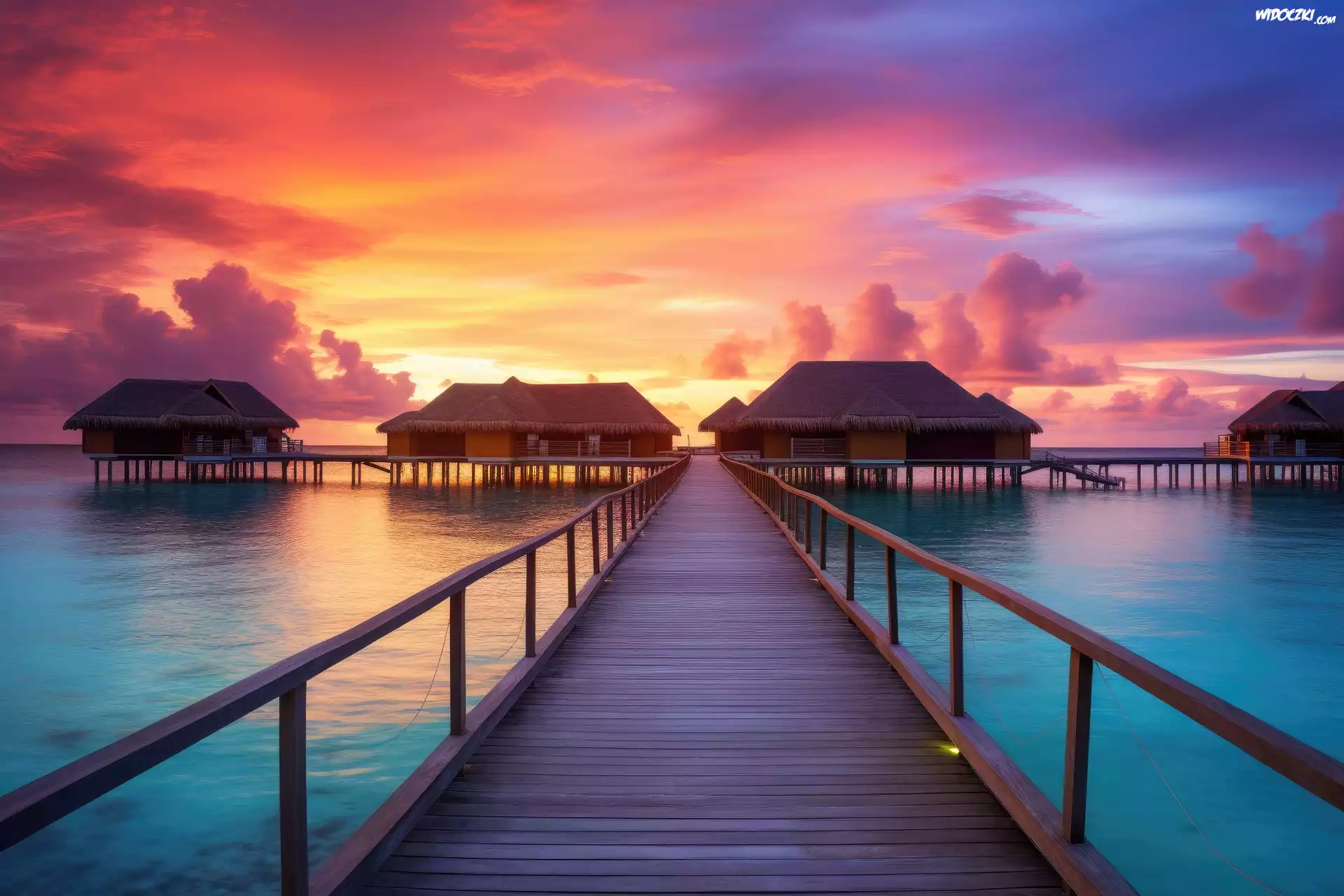 Zdjęcia, Pomost, Domki, Morze, Zachód słońca, Atol Addu, Malediwy