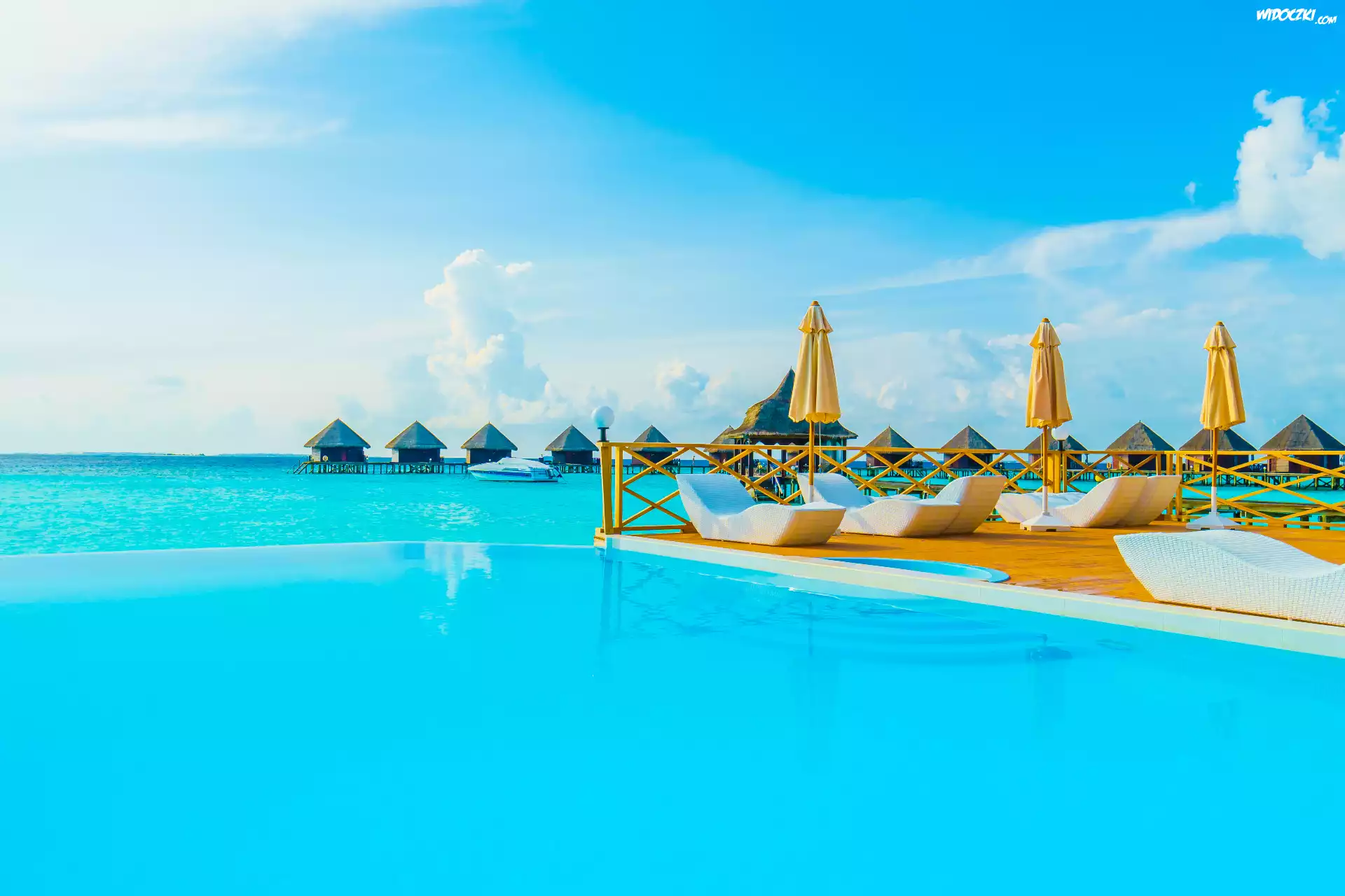 Lato, Wakacje, Morze, Basen, Domki, Parasole, Leżaki, Malediwy